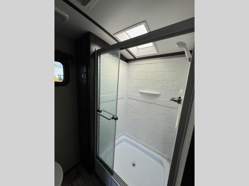 As you enter to your right there is a sliding door into the rear bathroom. Inside you will find a shower and linen cabinet along one side, a vanity with sink and overhead storage on the opposite side, and a toilet along the rear wall.
