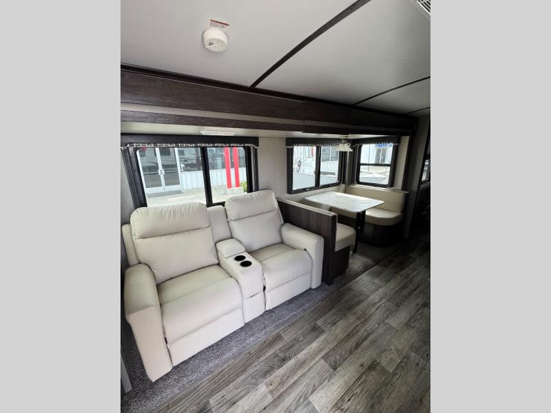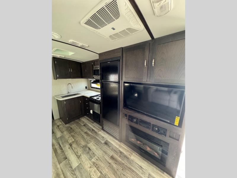 The main living and kitchen combined area includes a single slide out sofa sleeper and booth dinette providing more floor space, seating, and extra sleeping space when needed. On the opposite side you can enjoy the entertainment center with optional fireplace below, and entry closet. Next you will find a refrigerator, three burner range, corner countertop space, and a large kitchen sink. There are overhead cabinets for your dishes and things as well.