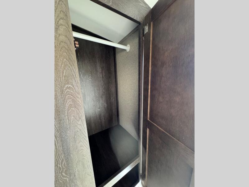 The front bedroom includes a space savings sliding door. Once inside you can rest on a queen size bed, store your camp clothes in the dual wardrobes, and place more items in the overhead storage above the bed.