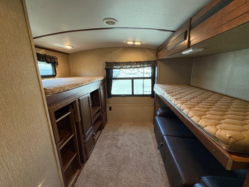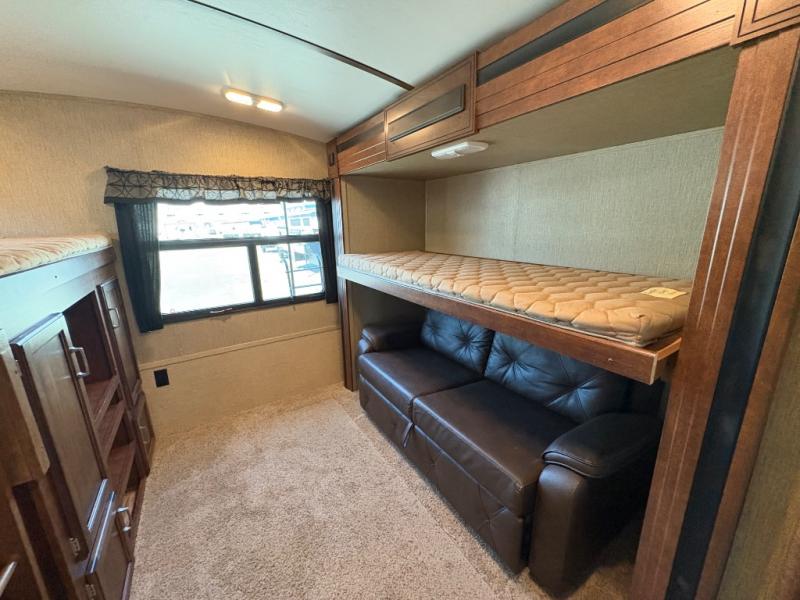 In the rear of the trailer there is a private bunkhouse featuring a sofa sleeper with bunk above along the road side. On the opposite side there is a second bunk above an entertainment center with storage.