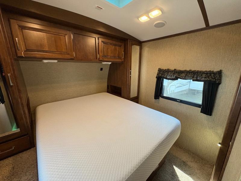 What I liked most: It has a really outdoor kitchen. It comes with everything you would wand, stove , grill, sink, expandable counter top, a drawer to put, a great looking wood, and a fridge. Frameless windows look great on the outside. The light bar under the awning is very helpful at night. Large outdoor speakers are enjoyed by everyone. The bedroom reading lights are adjustable and are bright. The kitchen island looks rather large and like it has more storage. The entertainment center looks like it was way more storage than what I am used to seeing.