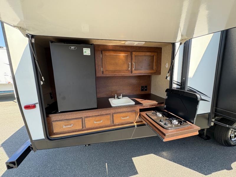 The outside kitchen is sure to catch your eye. There is a refrigerator, single kitchen sink, and flip-out stove top. You will also appreciate the storage that can be found in the front exterior pass-through compartment, plus much much more!