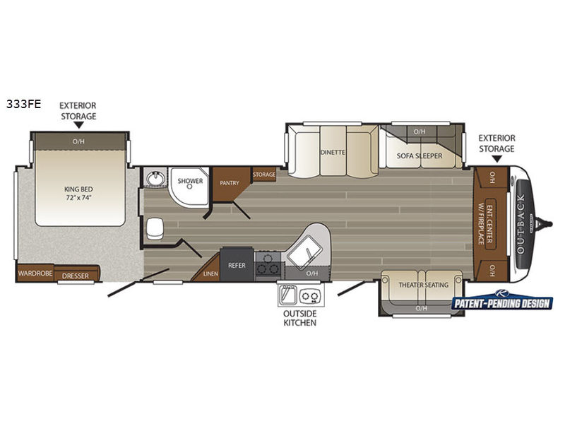 Triple slide outs, two entry doors, and a PanaView window above the front entertainment center are just a few of the features that are available on this Outback 333FE travel trailer.