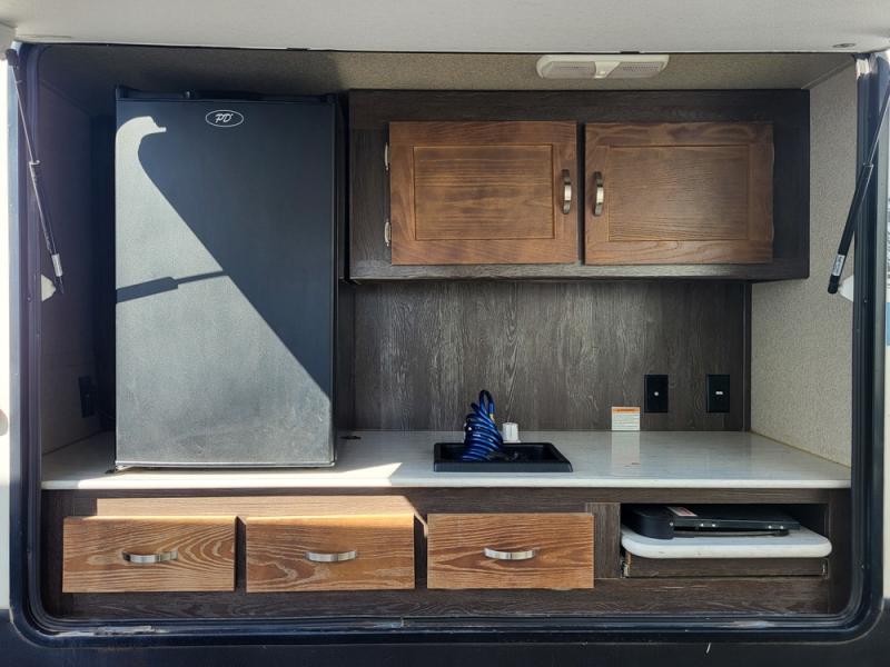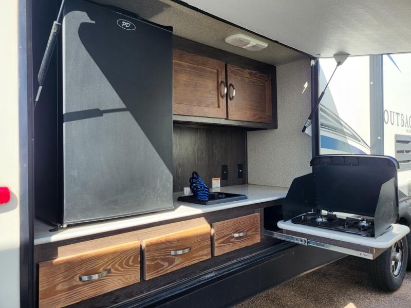 Load up your family, and enjoy time away with this Outback Ultra Lite travel trailer. Model 320UBH offers a private front bedroom with a queen bed for the owner, and a rear set of queen bunks for the kiddos or overnight guests. There is a single slide out with a booth dinette and deluxe sleeper sofa with arm bolsters for dining, playing game, or sleeping at night. The dual entry bath provides a sliding door from the bedroom, and a door across from the main entry into the trailer. You will find that the outside camp kitchen including a refrigerator is a "must have" for the outdoor chef, and the pass-through storage allows more gear to be packed for the trip, plus more!