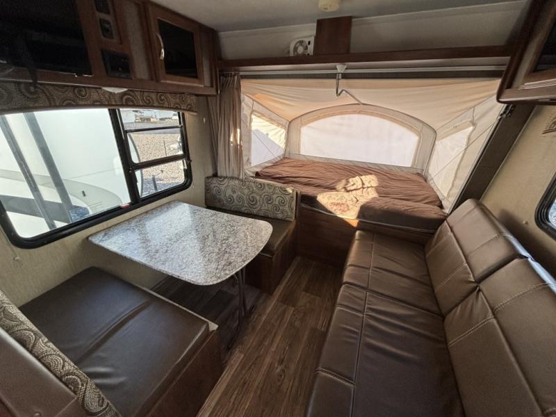 Thinking about ditching the tent and upgrading to an expandable trailer to take your family to different campgrounds around the state? As you step inside this Passport 171EXP Express model you will start envisioning who will sleep where, and how you can get off work. You can relax on the front tent end bed while the kids sleep on the rear tent end bed beside the full bath. You might choose to drink your morning coffee while sitting on the sofa or dinette, or relaxing outside on your camp chair. Don't worry about storage thanks to the overhead cabinets and pantry, plus the exterior pass-through compartment. It's time to throw the tent out and start enjoying sleeping through the night at your favorite campsite!