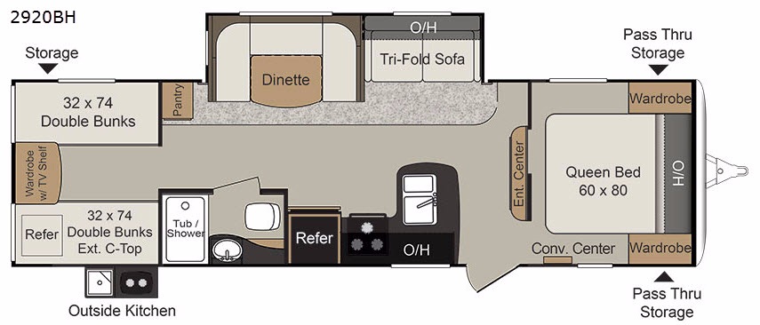 A room for yourself, plus a bunkhouse for the kids and their friends sounds like the perfect setup for the RV enthusiast that likes to travel with plenty of space for everyone. Just imagine your family inside this Passport 2920BH Grand Touring travel trailer after cooking outside on the outdoor kitchen and swimming in the lake. The main living area allows everyone a seat to eat meals and watch the TV. The kids can draw straws to decide which of the four bunks will be theirs for the weekend. Your spouse can choose her favorite side of the queen bed while you unload the extra large gear in the pass-through storage. Take a look to find even more features you will love!