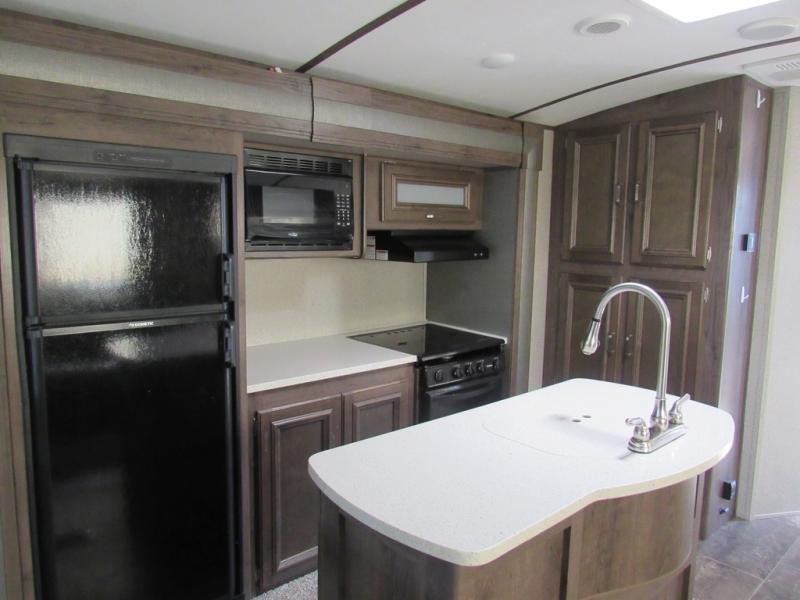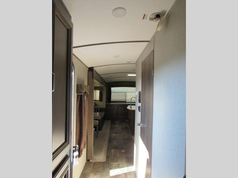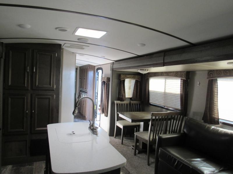 When you own a unit like this Keystone travel trailer, you own a piece of luxury that you can take along with you wherever you adventure next. Because of the 6' 8" vaulted ceilings, this trailer provides a spacious atmosphere for you to live in while you travel, and the 60" x 80" queen-size mattress gives you more space to sleep than a traditional RV mattress does. The large wardrobes that have been included in this trailer allow you to store more garments and outdoor accessories for your trip ahead, and the upgraded window treatments and leather furniture give this entire unit a modern look and stylish design.