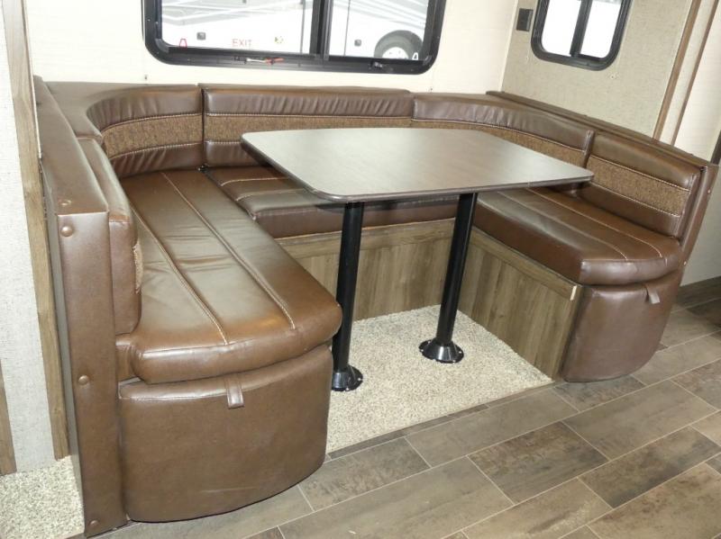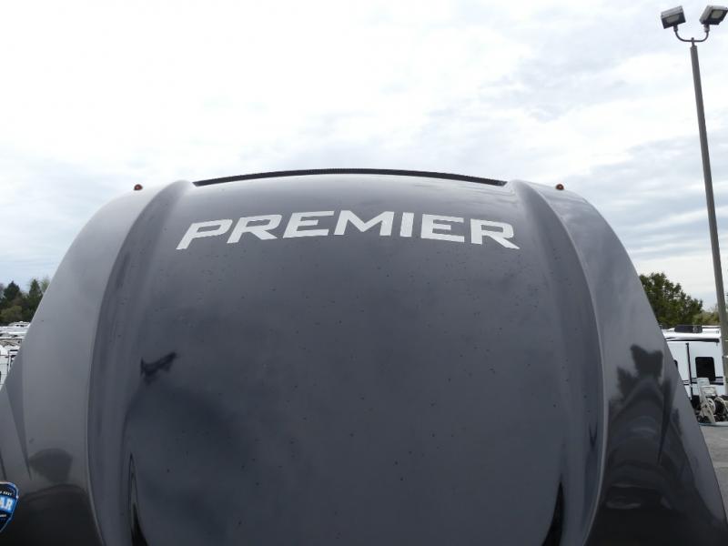 What truly sets this Premier Ultra Lite travel trailer apart from the rest of the competition is the max-depth slide room technology that it incorporates. Because of this constructive idea, the single slide that is included in this trailer provides you with the most utilized and available space that your slide room can give. The front private bedroom with a queen-size bed and the U-shaped booth dinette allow this trailer to sleep four people while you travel, and the rear bathroom gives everyone an extra bit of privacy as they get ready for the day ahead. One less cluttering item that you will have to worry about in this trailer is the laundry because with the addition of the laundry chute, your dirty garments can hide safely in the exterior pass-through storage that is located below the master bedroom.