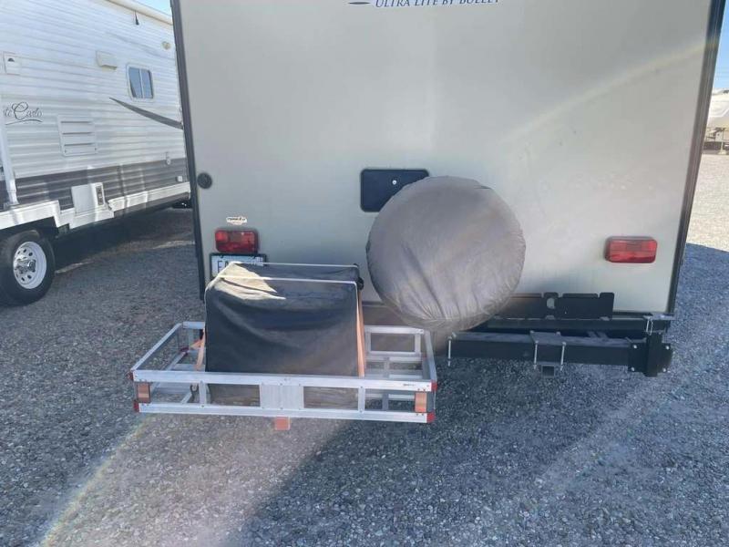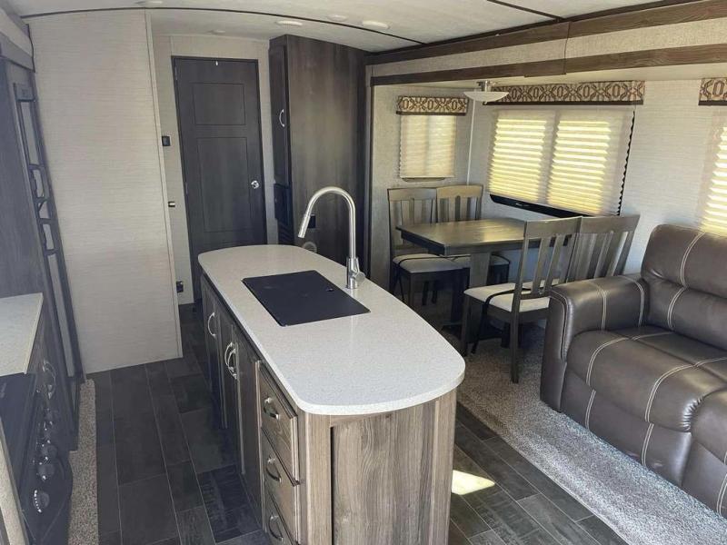 When you take your next trip across the country in this Premier Ultra Lite travel trailer, you will see for yourself what truly sets this trailer apart from all others. With its max-depth slide room technology, you get the most utilized and available space possible in the two slides that this trailer provides, which also gives this unit a beautifully open living area, and because of the large closets and pantries, this trailer also aids all of your storage needs. The private bedroom is a wonderful place to escape after a long day of traveling, and the outdoor kitchen allows you to take your dinner preparations into the fresh air.