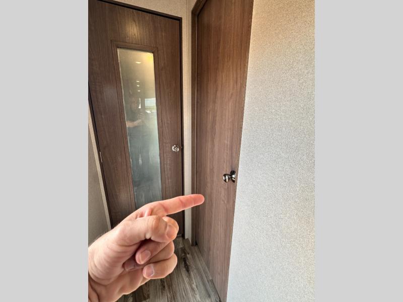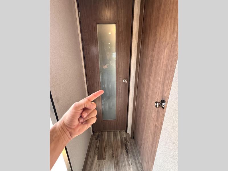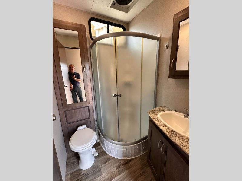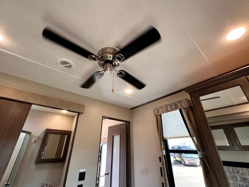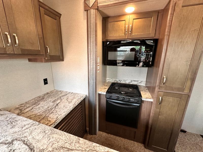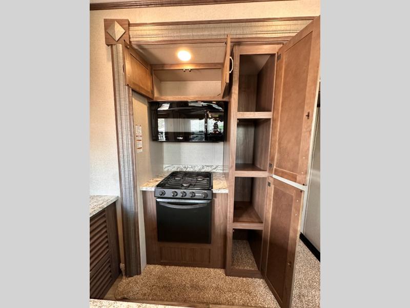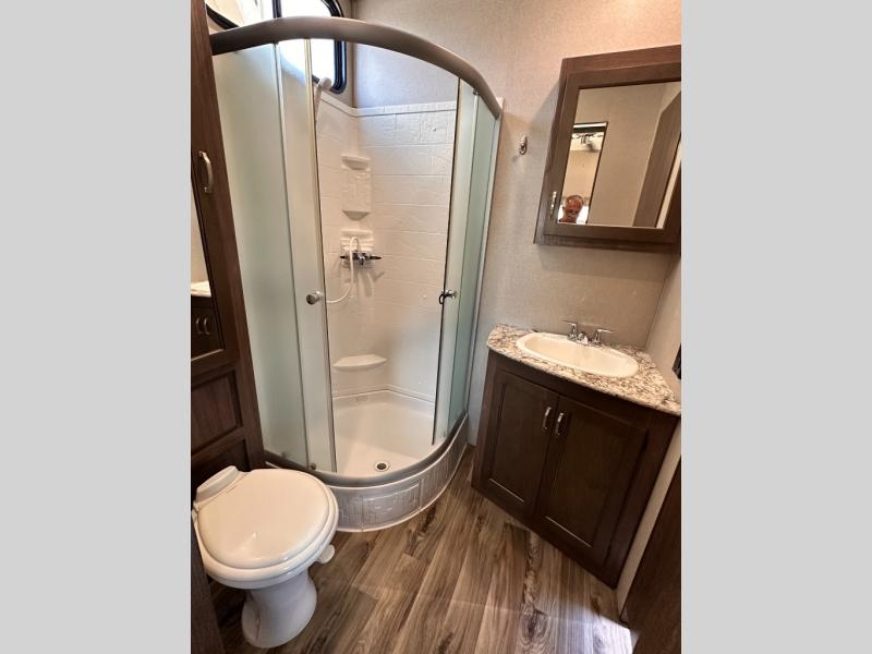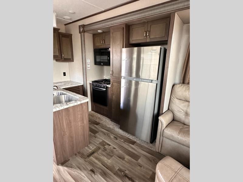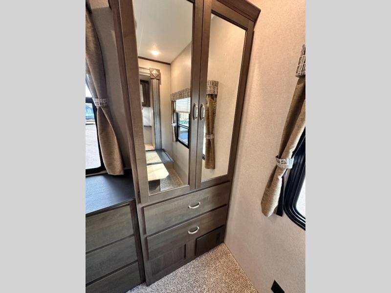 If you are planning on staying for an extended period in any one place, then I would suggest you take a look at this Keystone Retreat model. You have an entertainment center in the front with a few different seating areas, so your guests are sure to have a place to relax when they come to visit. There is even a place for them to sleep if they want to spend the night. There is a second bedroom with a sofa sleeper and a fold down bunk. They even have a place for storing their things. You as the owners will have your own private bedroom in the rear; here you have a queen bed for a good night's rest and a place for your things. There is even a private entry into the bathroom for convenience at night.