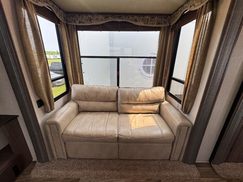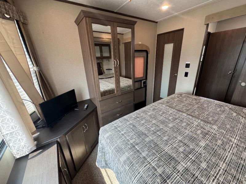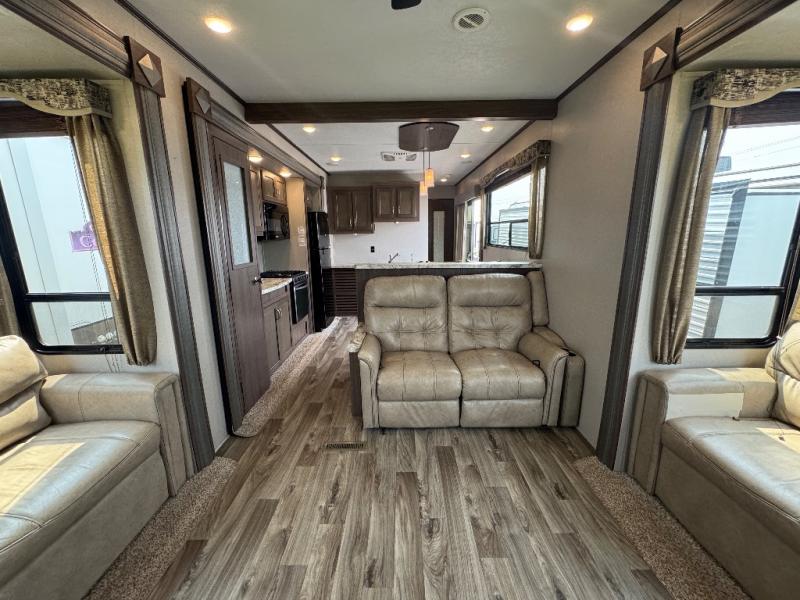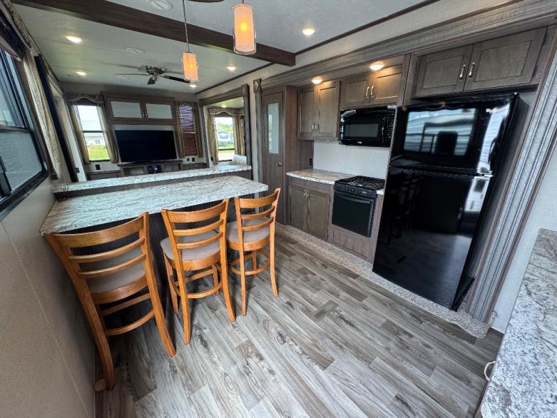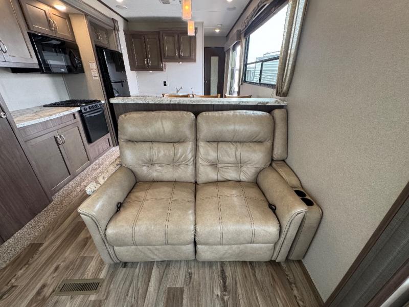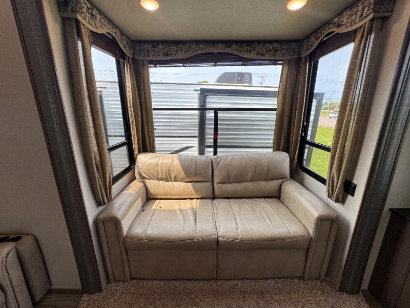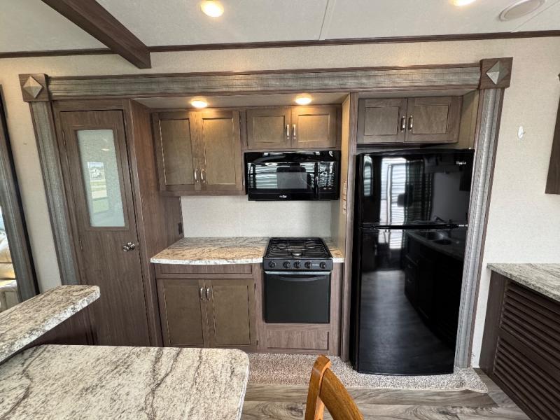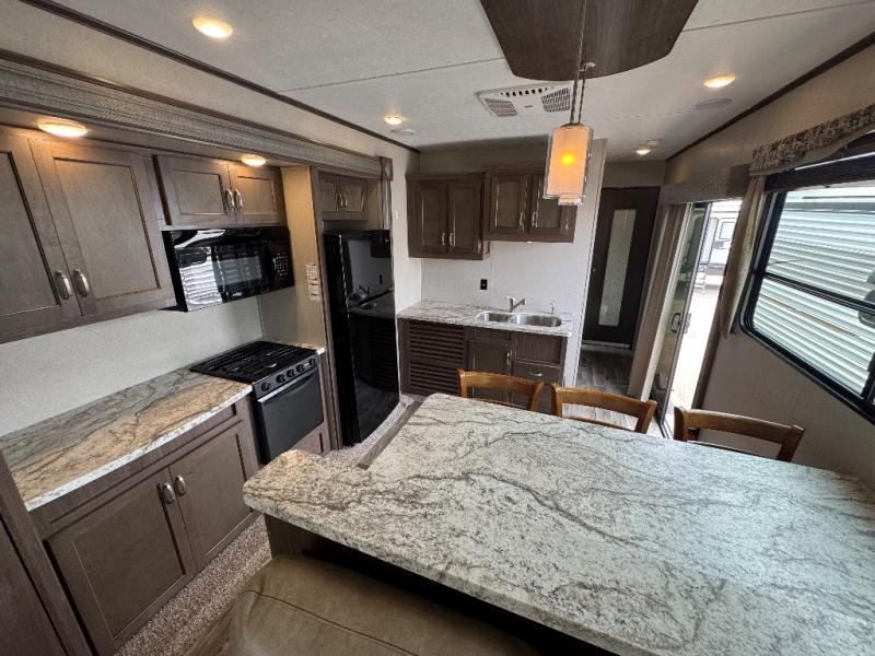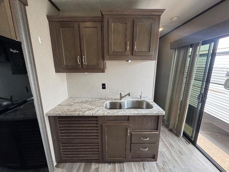 This 391RDEN is the unit you want to take a look at if you are planning on vacationing for a long period of time. This rear living unit gives your guests space of their own if they want to use the sleeper sofas for their sleeping space at night. The private front bedroom has a king bed and plenty of storage options for your things. There is a private entry door into the bathroom for convenience especially at night. The kitchen is nice and big, giving you plenty of space for prepping for meals, cooking them and cleaning up afterward. The residentially sized fridge will give you plenty of room for storing your perishables while you are away from home.