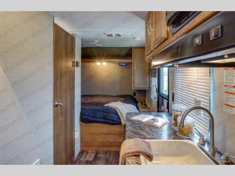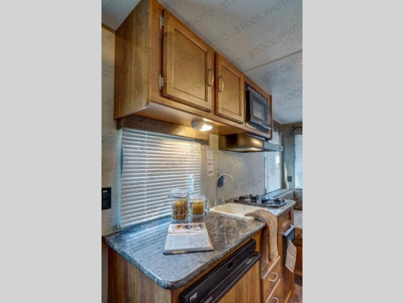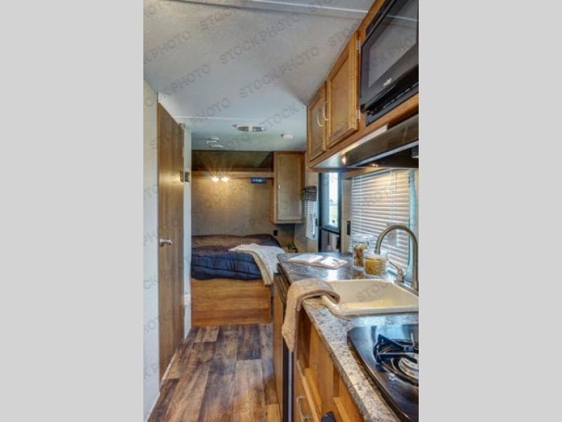The kitchen area is beside the entry door and features counter space, overhead cabinets, a single sink, and a two burner cook-top. A food storage pantry is on the opposite side of the trailer.