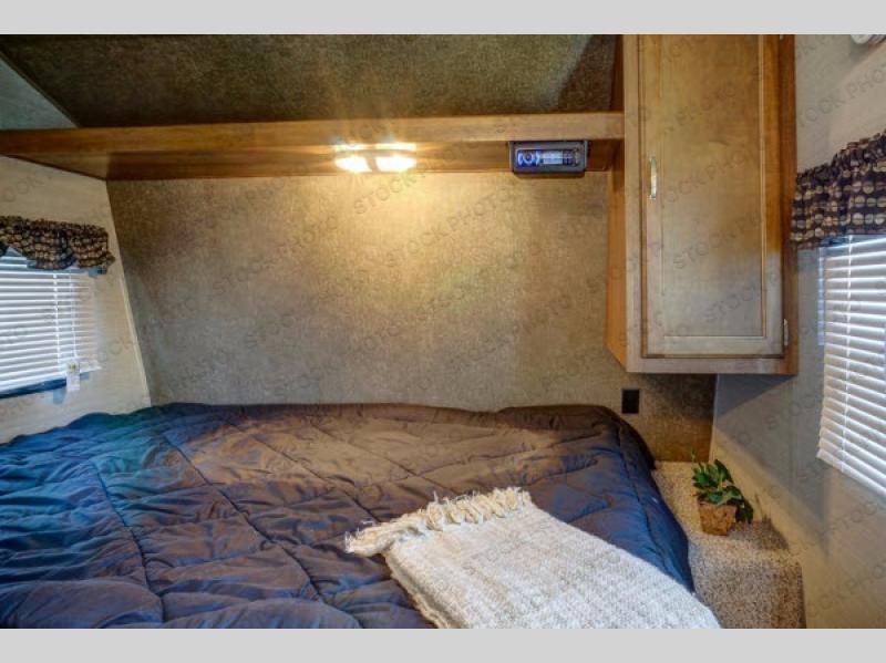 Step inside to see a front queen bed with overhead storage across the front wall, and a closet at the foot of the bed. The bed is turned width wise with the head of the bed along the road side wall.