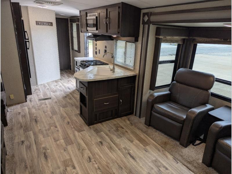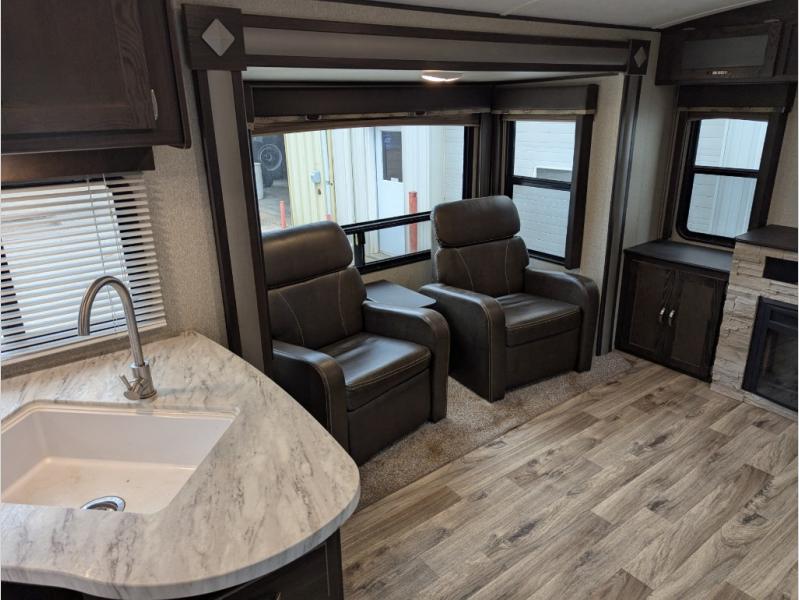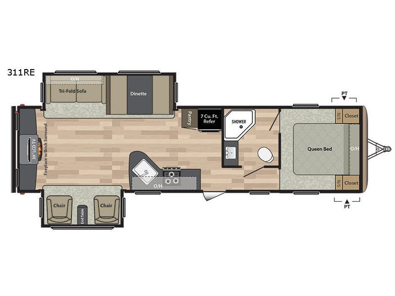 Your will love this roomy Springdale floorplan! There is a full wall entertainment center with a large TV and fireplace that has "brick" surround. Choose from a few places for relaxing, eating your meals, or just enjoying one another's company. There are two chairs with a table between them, a tri-fold sofa, and a booth dinette. The cook in the kitchen will love having a place for cooking all of the family favorites, and after a long day of adventuring, you will have the private front bedroom with a queen bed for a good night's rest.