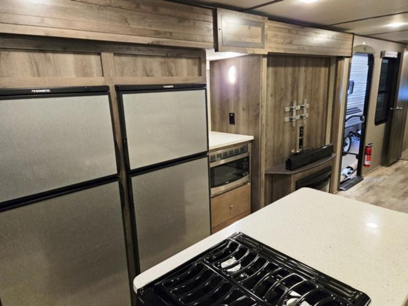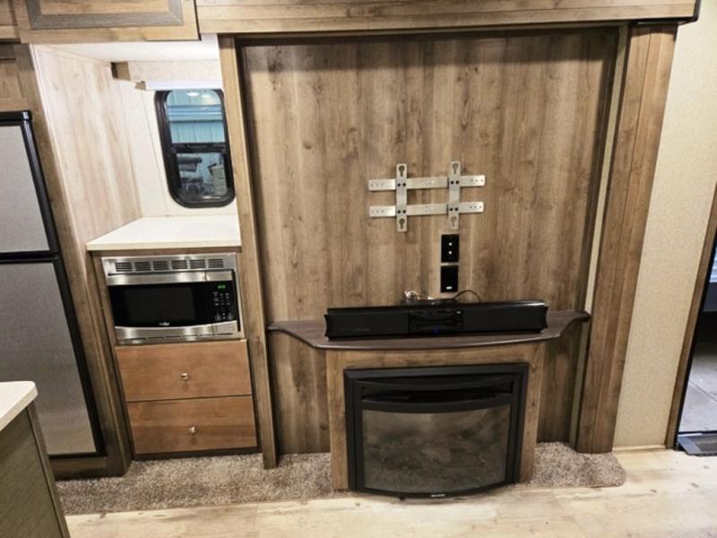 Setting up in your campsite will be super easy with the auto leveling control being just the touch of a button. Next, using the same remote, slide out all three slides and put up the electric awning. Unload your groceries if you shopped on your way, then get ready to enjoy your day! You might like to dine outdoors if it is nice. You can easily keep an eye on your food that's cooking when using the outdoor kitchen on a beautiful day. With a 32" HD LED TV outside, you can even enjoy your favorite television show or a movie while you prepare dinner for your family. At night, a king bed in the private rear bedroom will be a welcome retreat. Your children or guests can enjoy the tri-fold sofa in the living area for a great night's rest. They certainly won't mind being out in the living room with a 55" HD LED TV and fireplace nearby!