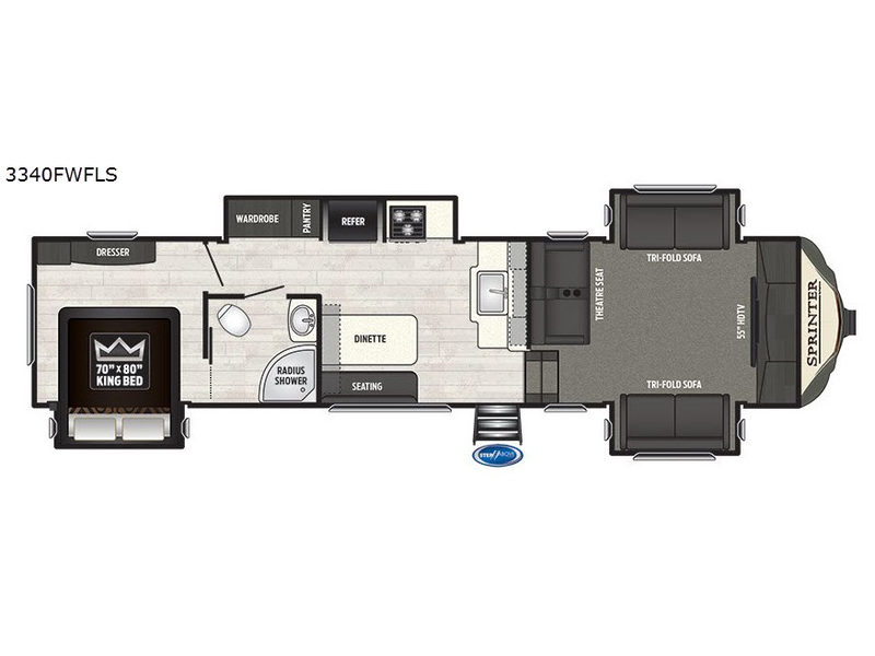 If you have been searching for separate rooms in your next fifth wheel this Sprinter by Keystone RV model 3340FWFLS might be the one! The front living area offers 2 opposing tri-fold sofa slide outs, theatre seats, and a 55" HDTV with storage. If you need more sleeping space than the master bedroom's king size bed provides, the sofas fold down for your overnight guests. The third slide out is located in the bedroom where you also have access into the bathroom as well as through the kitchen entry. The fourth slide out widens the cook's kitchen space to make meals just like at home with cold storage from a double door refrigerator, plus more!