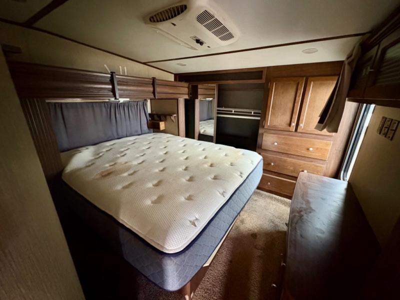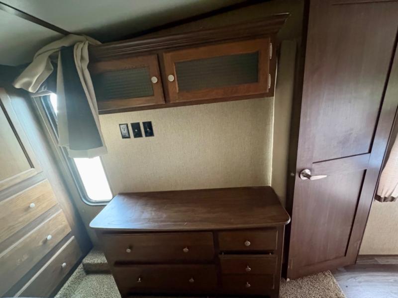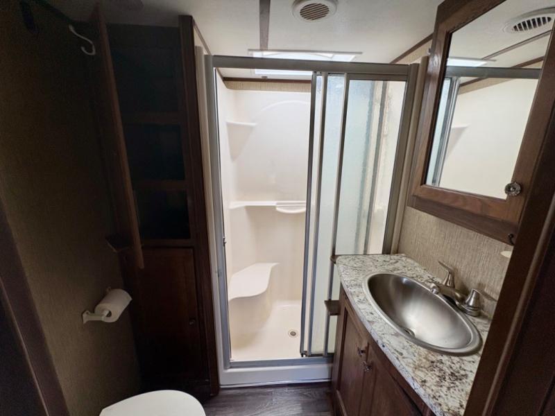 Enter model 353FWDEN and head up the steps on your right to the front master bedroom and side aisle bath. The bathroom offers a residential shower, toilet, sink, and linen cabinet. The private master bedroom at the end of the hall features a slide out residential queen size bed. There is also a dresser opposite, and full front wall wardrobe and closet prepped for a washer/dryer for all of your clothing storage needs.