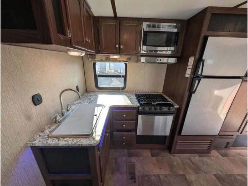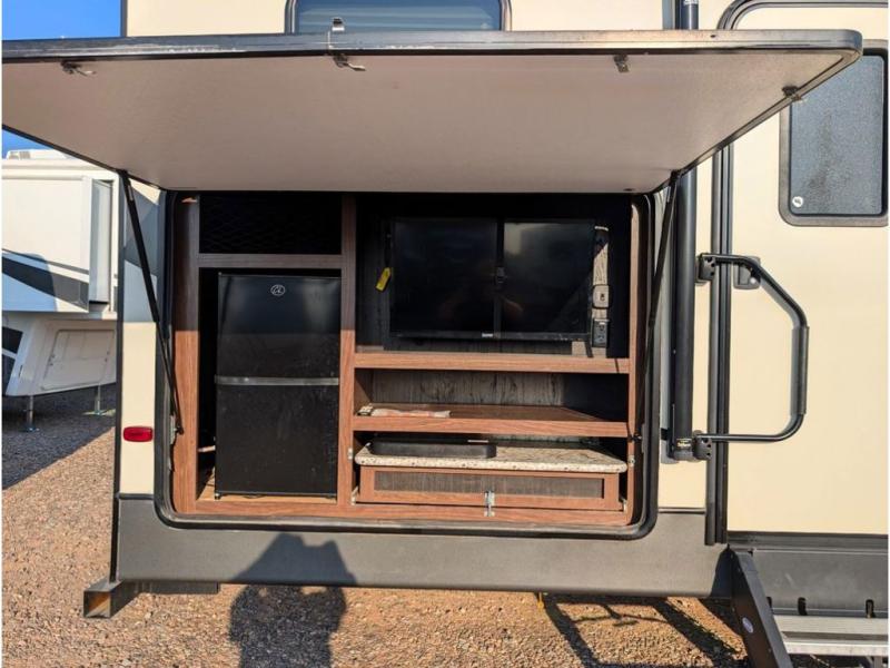 Come see why this Sprinter Campfire travel trailer by Keystone RV is perfect for your growing family! This model has double slide outs for some added interior walk around space, plus you can comfortably sleep up to eight individuals! The front bedroom has a residential queen bed for a good night's rest and has overhead cabinets, a wardrobe, and a closet for all of your things. Enjoy more time outdoors with your family, grab a quick snack from the exterior kitchen. You will find a refrigerator, a two burner cook-top, and a 32" HDTV which makes your outdoor movie night complete! Now you just need to gather your family, your camping gear, and set out to your favorite campsite!