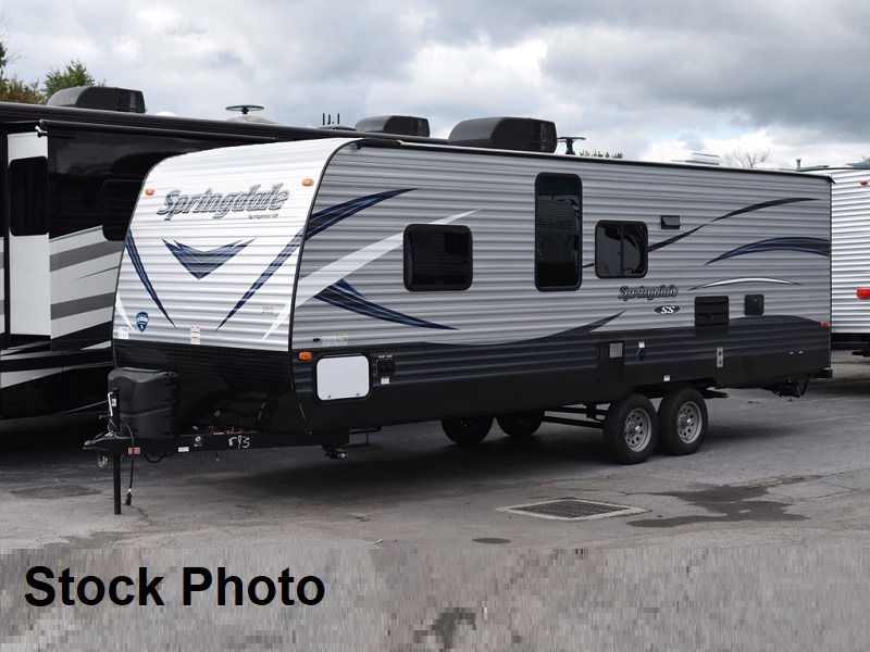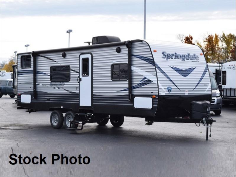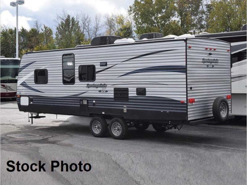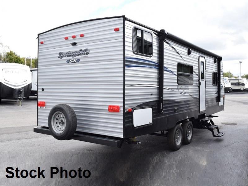 Step inside this Springdale Summerland travel trailer 2600TB and see just how convenient your camping can be. There is sleeping space for up to eight individuals, and all the amenities needed to make traveling fun. A booth dinette provides a place for dining and playing board games, plus it too can be made into additional sleeping space, if needed, by folding down the table. Double bed bunk beds can be found in the left rear corner of this trailer that the kids will just LOVE. Inside and outside there is plenty of storage, there are overhead cabinets and cupboards inside and pass through storage outside.