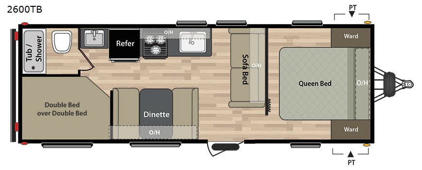 Step inside this Springdale Summerland travel trailer 2600TB and see just how convenient your camping can be. There is sleeping space for up to eight individuals, and all the amenities needed to make traveling fun. A booth dinette provides a place for dining and playing board games, plus it too can be made into additional sleeping space, if needed, by folding down the table. Double bed bunk beds can be found in the left rear corner of this trailer that the kids will just LOVE. Inside and outside there is plenty of storage, there are overhead cabinets and cupboards inside and pass through storage outside.