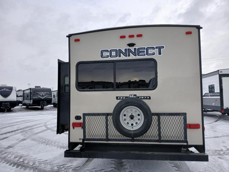 This Connect travel trailer is light enough to easily tow, but it is not light on amenities. All of the things that you love about your home have been included in this trailer. The front, private bedroom with a queen-size bed not only provides a separate place for you to unwind and relax from the day's adventures, but it also provides a private bathroom entrance. Because this unit can sleep five people comfortably during any wilderness excursion, you can bring along the whole family for a weekend of fun, and you can also feel confident in bringing along any necessary camping gear because the exterior pass-through storage will hold all of it.