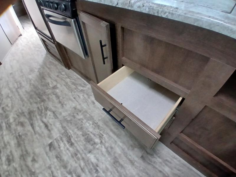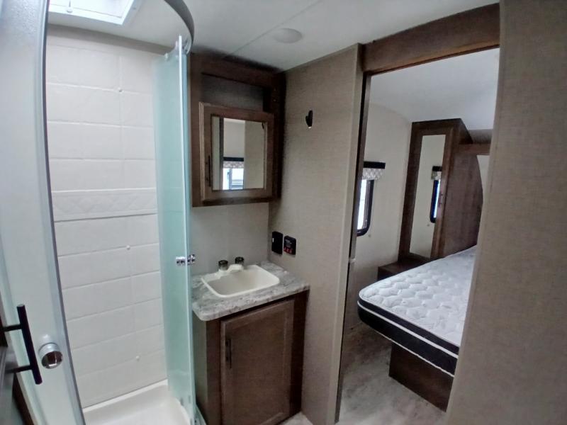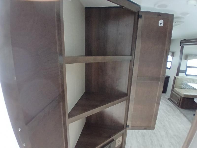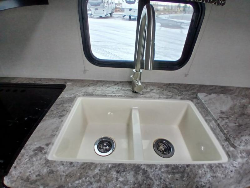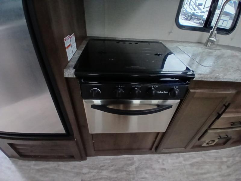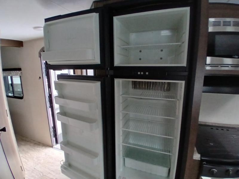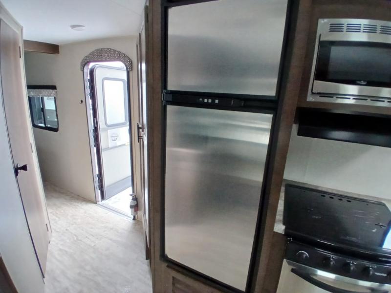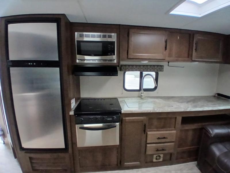 One of the best features of this KZ RV travel trailer is the fully-stocked kitchen that allows you to keep everyone full and satisfied, no matter where you've traveled. The 3-burner range top with oven, gives you a place to whip up your favorite cookie recipe, and the 8 cubic foot stainless steel refrigerator allows you to store those sweets so that they stay fresh for the duration of the trip. If you enjoy nature and want to soak it up as much as possible, then you will undoubtedly be spending your evenings outside underneath the electric awning with LED lights, listening to happy melodies playing on the exterior speakers.