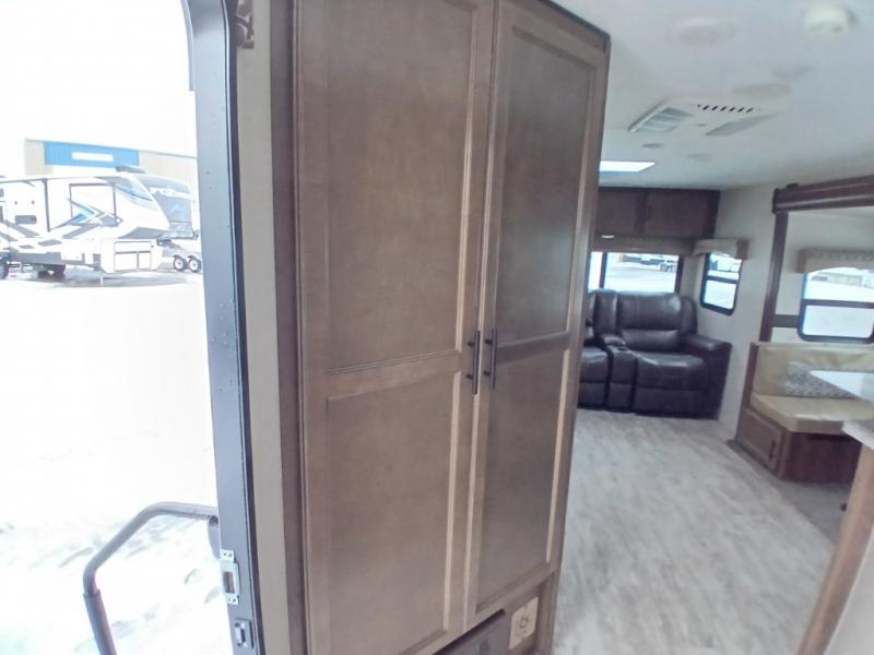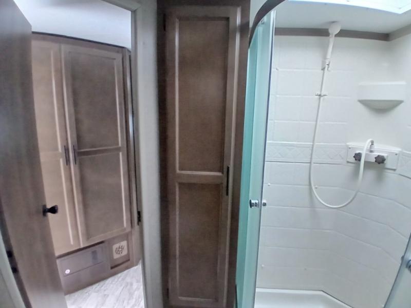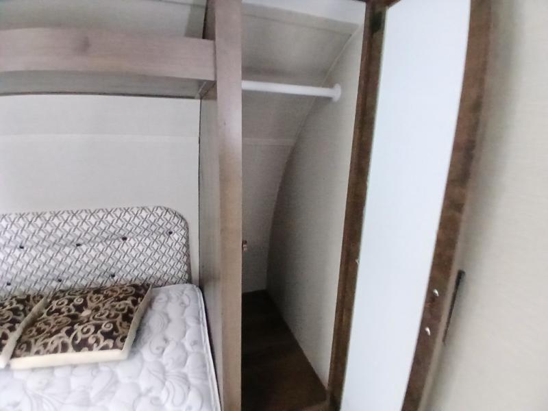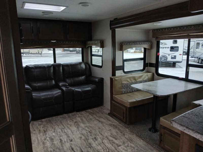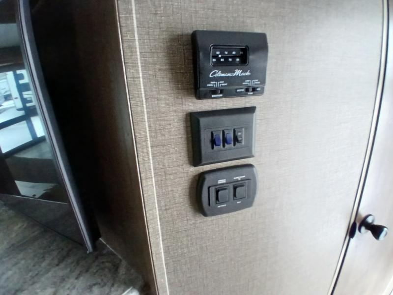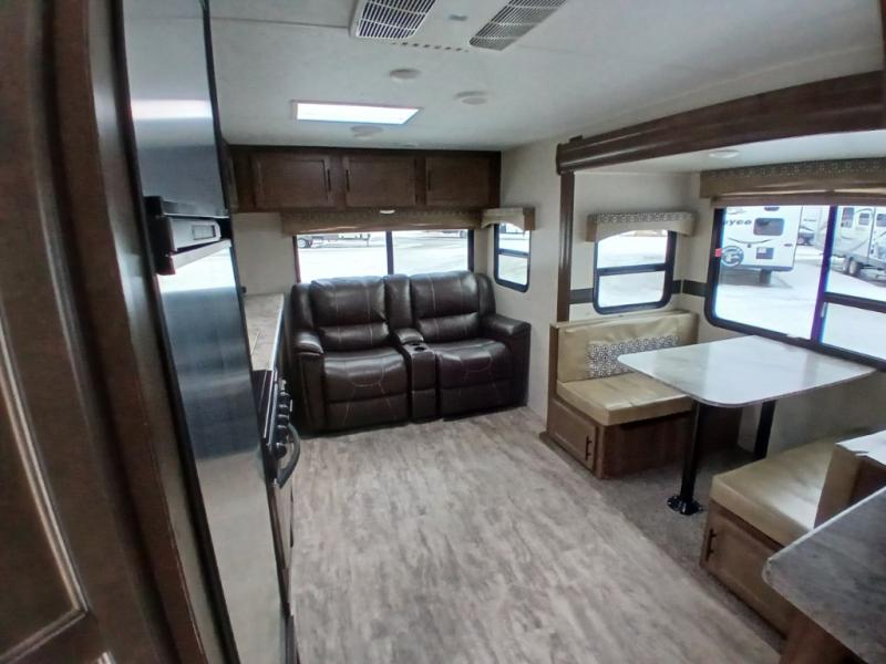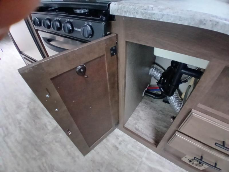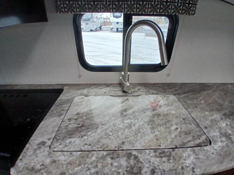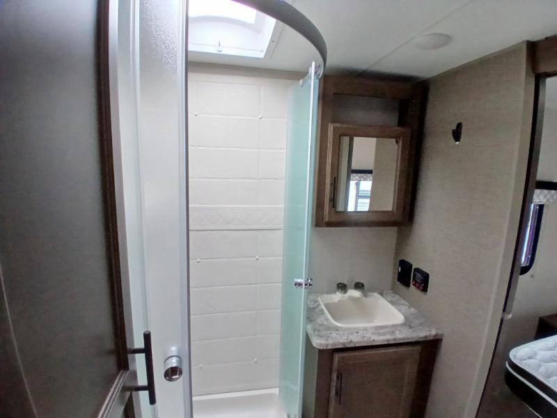 One of the best features of this KZ RV travel trailer is the fully-stocked kitchen that allows you to keep everyone full and satisfied, no matter where you've traveled. The 3-burner range top with oven, gives you a place to whip up your favorite cookie recipe, and the 8 cubic foot stainless steel refrigerator allows you to store those sweets so that they stay fresh for the duration of the trip. If you enjoy nature and want to soak it up as much as possible, then you will undoubtedly be spending your evenings outside underneath the electric awning with LED lights, listening to happy melodies playing on the exterior speakers.