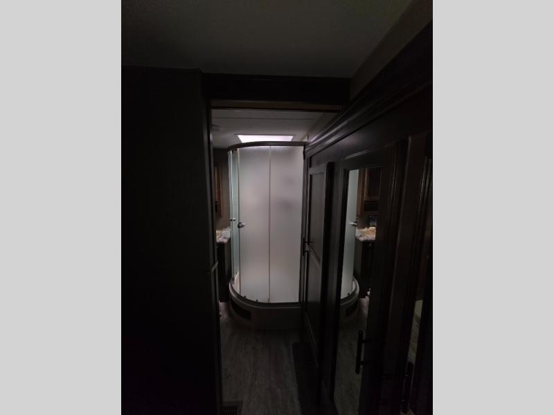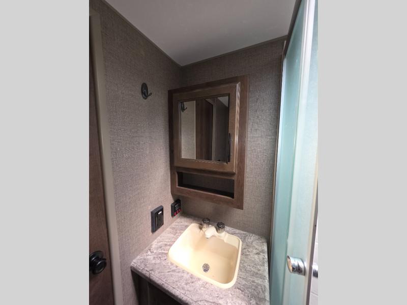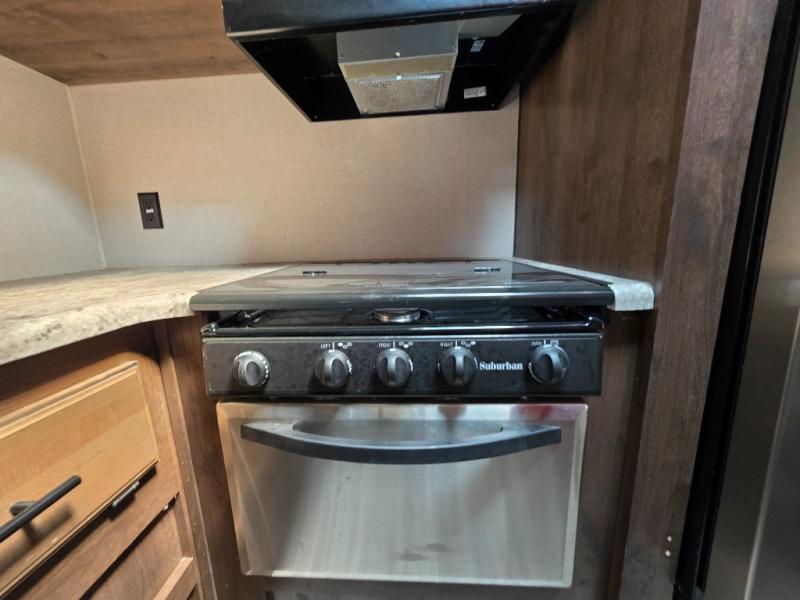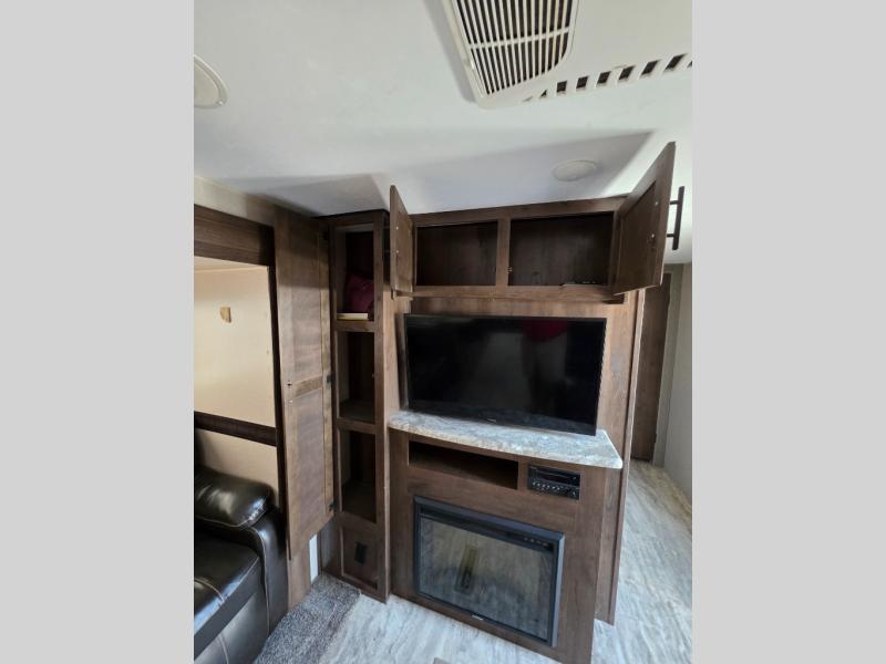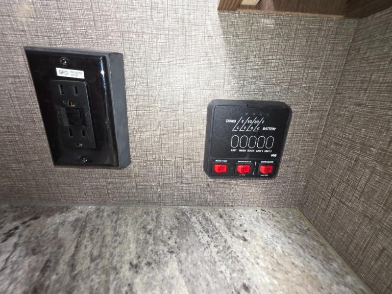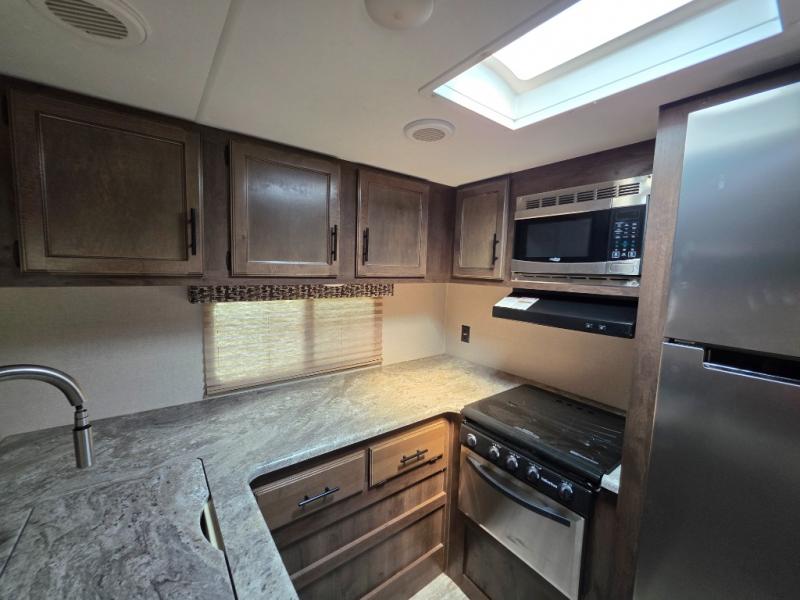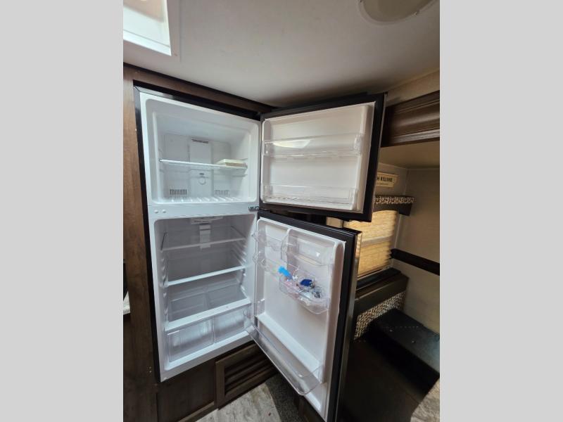 One of the best features of this KZ RV travel trailer is the fully-stocked kitchen that allows you to keep everyone full and satisfied, no matter where you've traveled. The 3-burner range top with oven, gives you a place to whip up your favorite cookie recipe, and the 8 cubic foot stainless steel refrigerator allows you to store those sweets so that they stay fresh for the duration of the trip. If you enjoy nature and want to soak it up as much as possible, then you will undoubtedly be spending your evenings outside underneath the electric awning with LED lights, listening to happy melodies playing on the exterior speakers.