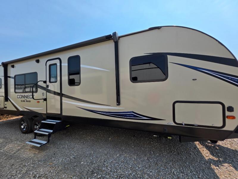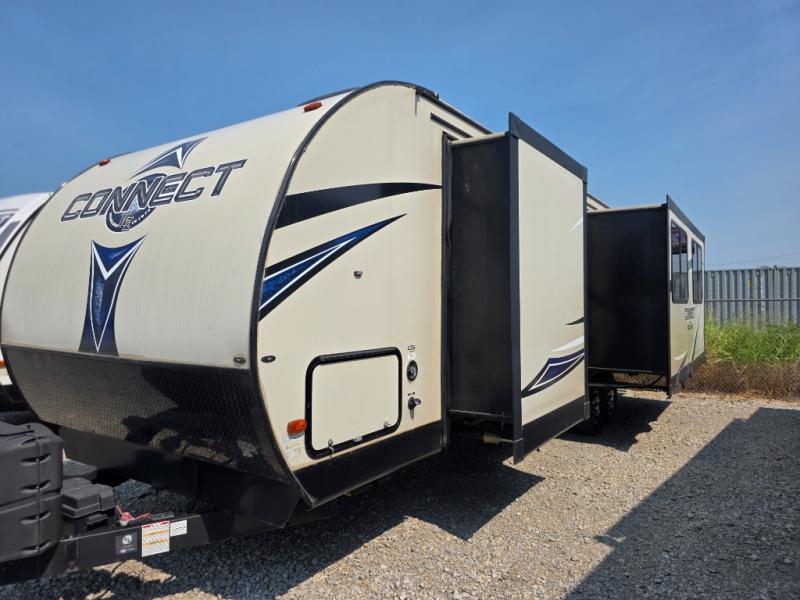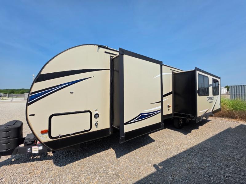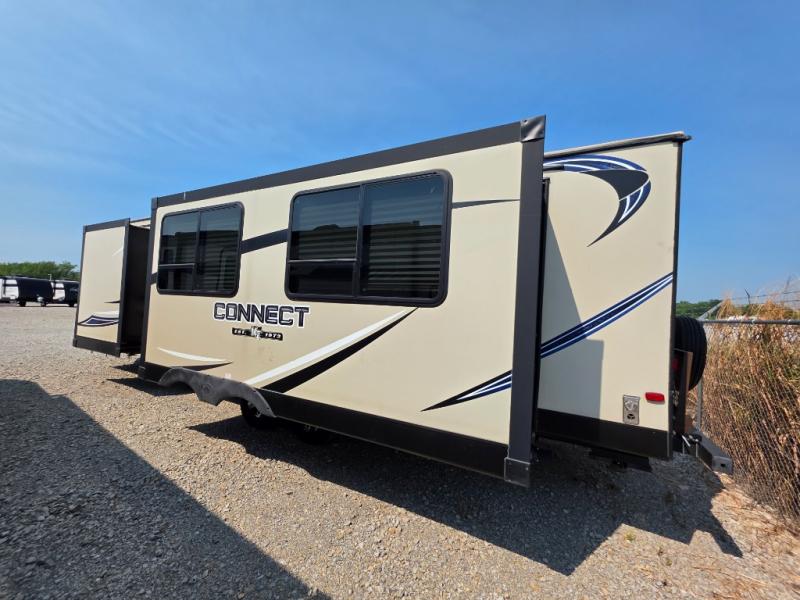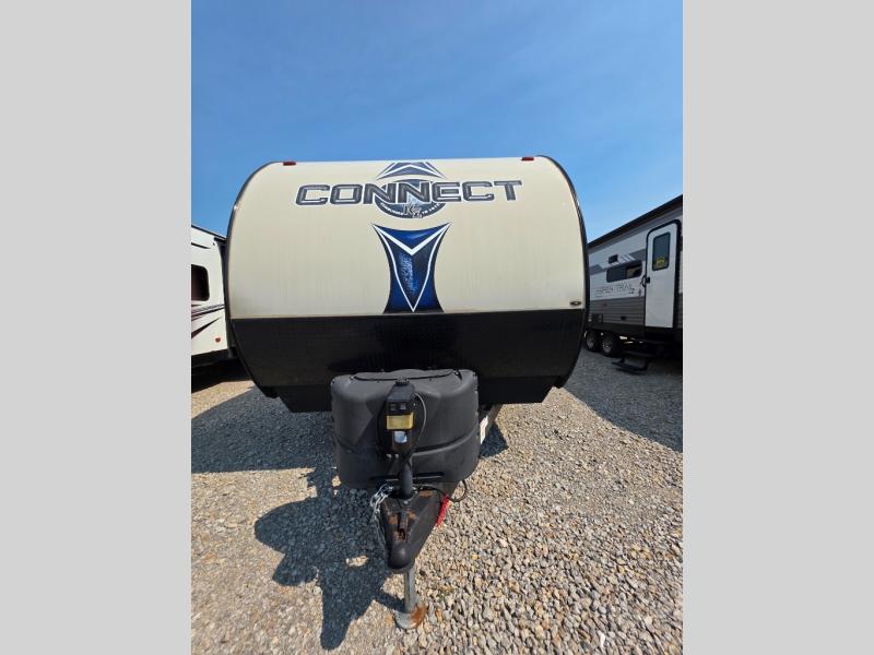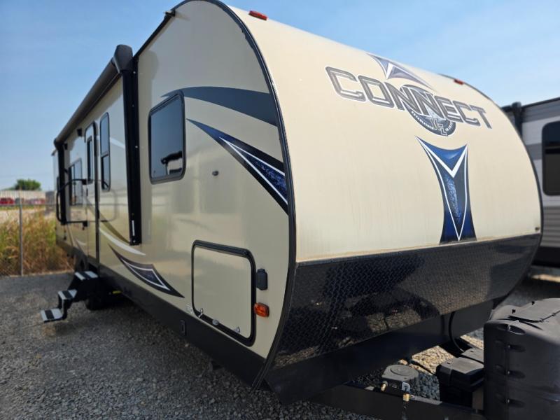 This Connect travel trailer is a light-weight trailer that is heavy in comfort. The queen-size bed in the front, private bedroom will give you the feeling that you're traveling in your own home because it also contains its own private bathroom entrance, and because there have been two slides added into the layout of this trailer, it has plenty of space in the living area for a multi-functional U-shaped booth dinette.