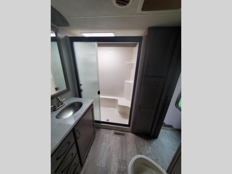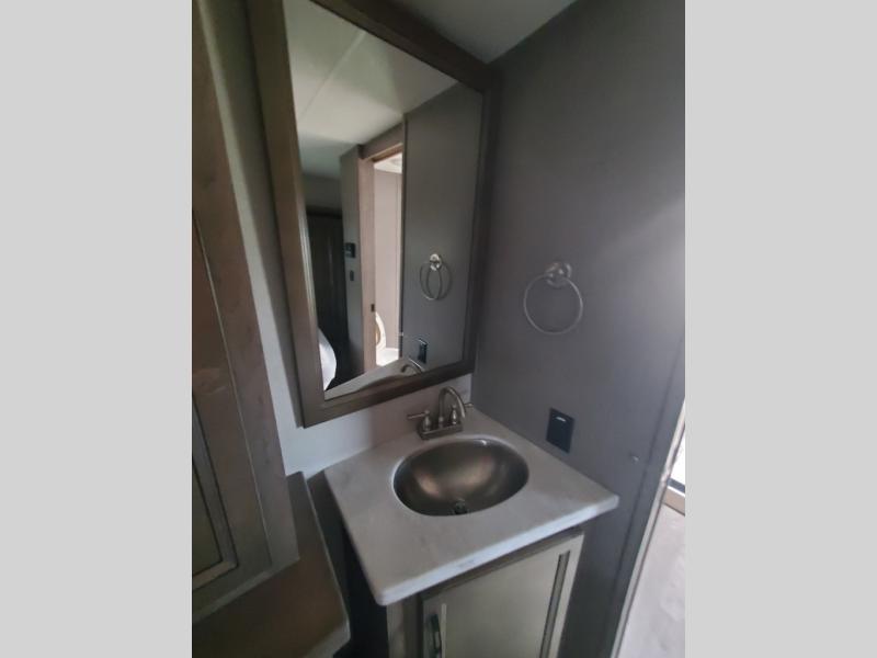 You will have everything you need to make your next camping trip fun and comfortable in this Durango Gold G384RLT. This fifth wheel by KZ features a deluxe sleeper sofa for seating during the day and convert into a sleeping space at night. The front private bedroom has a single sink, full length closet, and dresser to give you that home away from home feel. You can bring whatever you need because there is plenty of space inside the pass-through storage. Meal prep is made easy thanks to the kitchen island with the option to add a dishwasher which would be helpful while on your extended vacation. Keep the night's alive socializing underneath the 11' electric awning and you can even add a second optional 17' electric awning both with LED lights.
