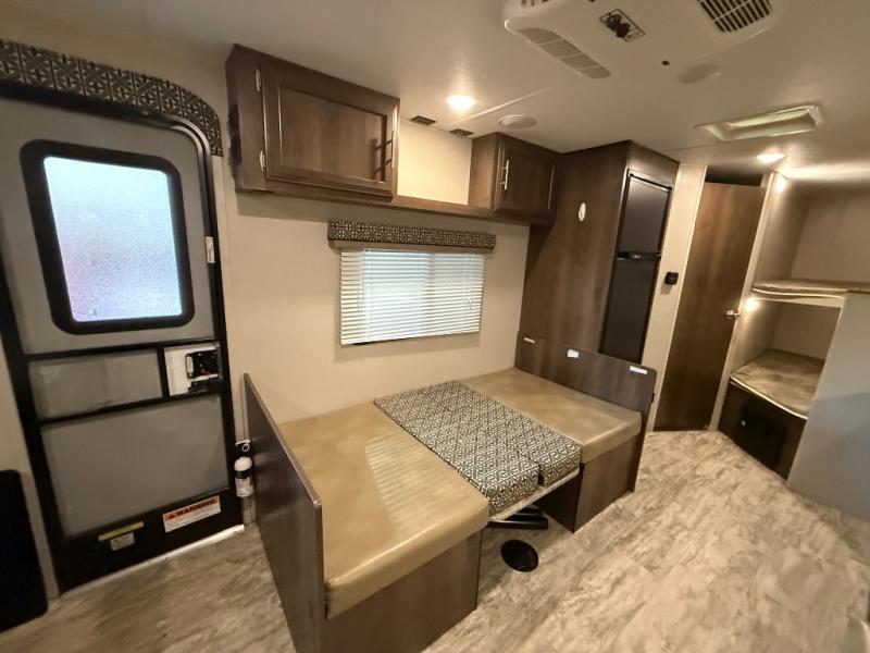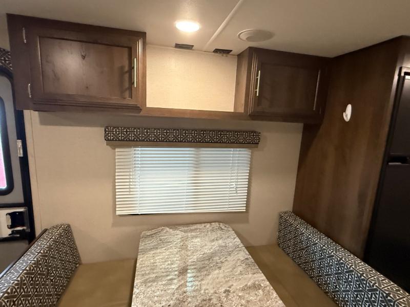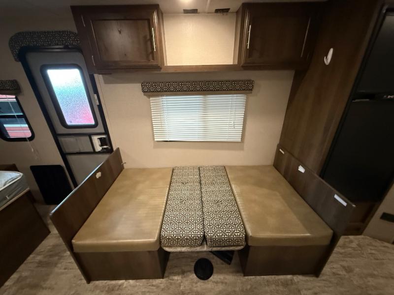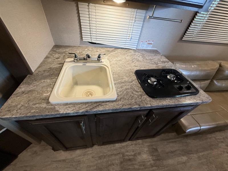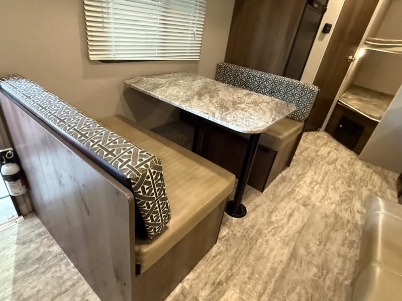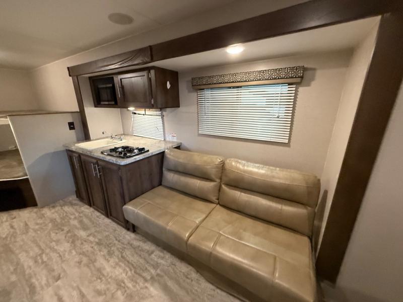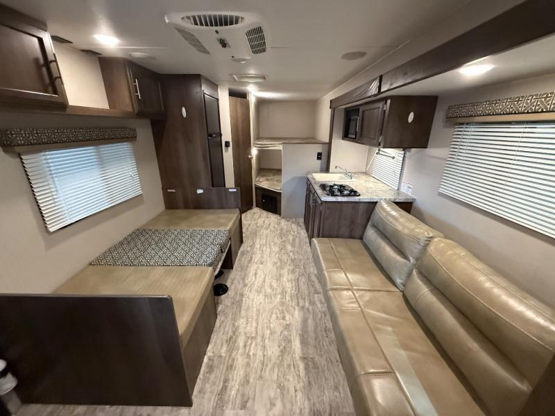 The 2018 KZ Escape E231BH is a lightweight, family-friendly travel trailer featuring double-over-double bunks, a queen bed, and a spacious U-shaped dinette slide. It offers sleeping space for up to 8 people, a full kitchen, and a rear bathroom with a tub/shower combo. With a compact size and easy towability, it’s a great option for families or weekend adventurers.