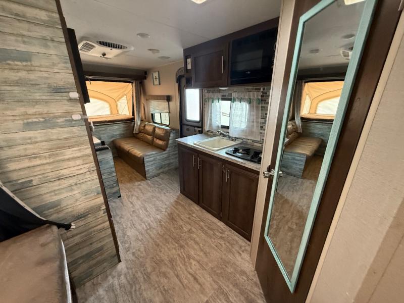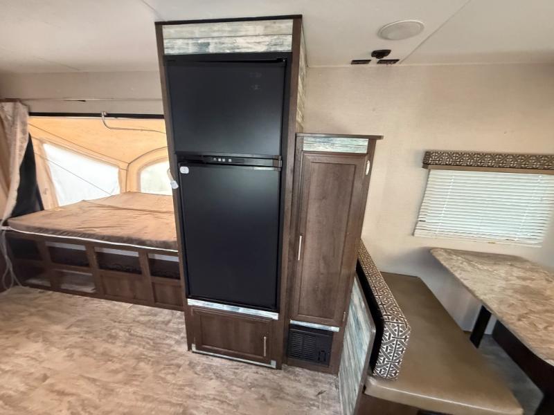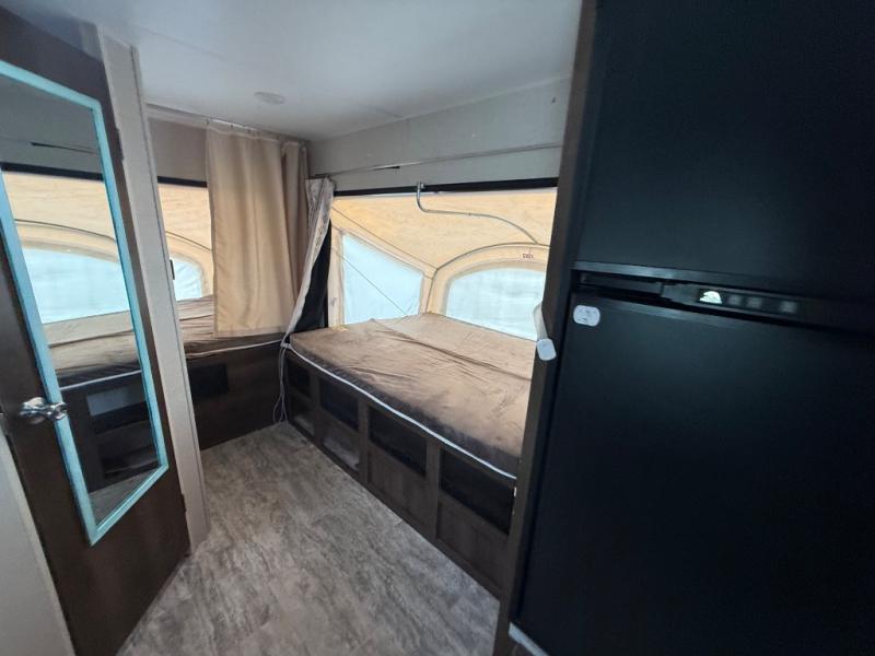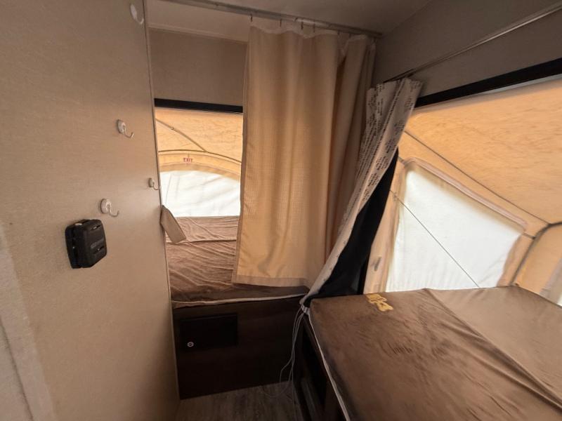 This Escape E180RBT expandable by KZ is perfect for a bigger family because it has plenty of sleeping space with 3 tent beds. It is equipped with tinted windows to provide you with more privacy, but it is still bright throughout the expandable because of the LED lighting. If you need plenty of space to store all your camping needs then the front trunk door is the best place to accomplish that!