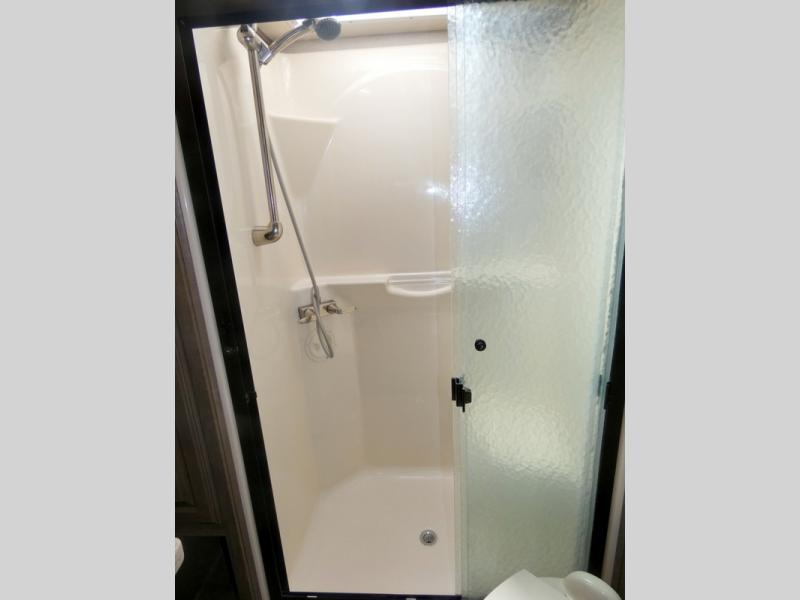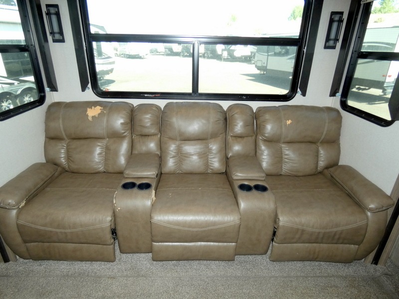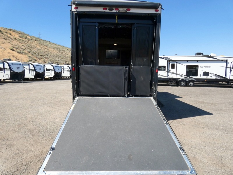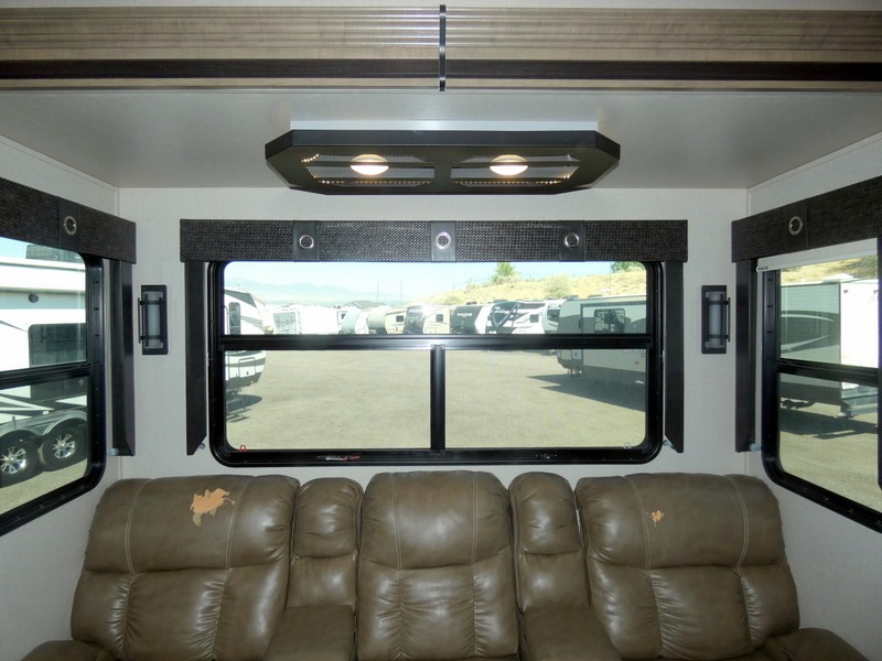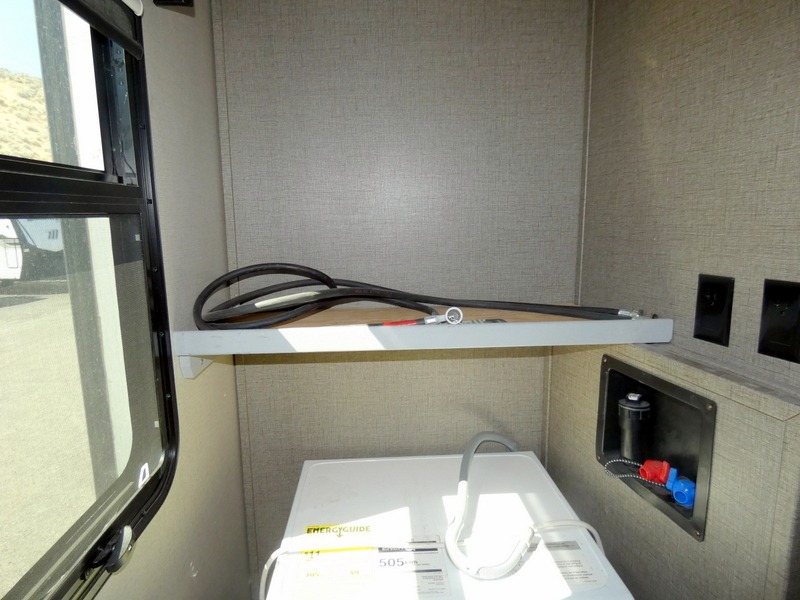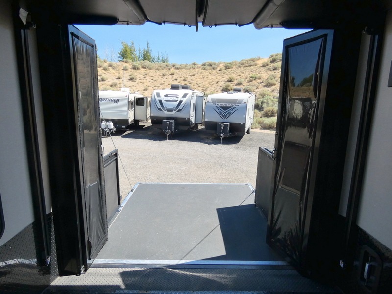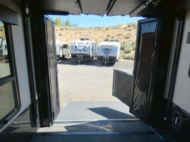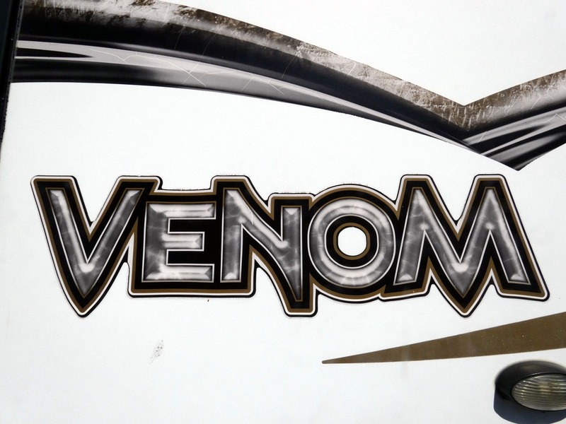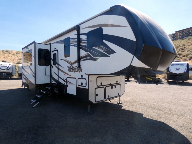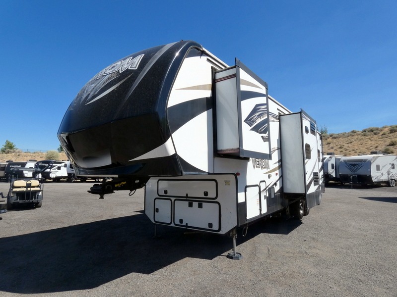 Hit the road with this Venom V3411TK toy hauler fifth wheel knowing that it is all about fun once you get to your favorite spot! You will have 11' of cargo storage for your off-road toys, a washer and dryer space, and a 40" x 96" loft bed. Just imagine sleeping in the master bedroom on a queen bed with plenty of storage after getting cleaned up in the residential shower with seat after a dirty off-road ride. Before heading out the next morning, you can relax on one of the three theater seats which are across from the entertainment center and full kitchen. Outside there is a pass-through storage area for extra camping gear, an 18' awning and more. Take a look inside the garage, you will be sold!