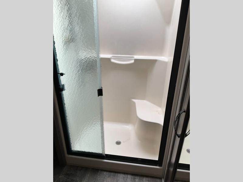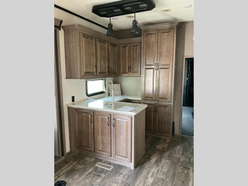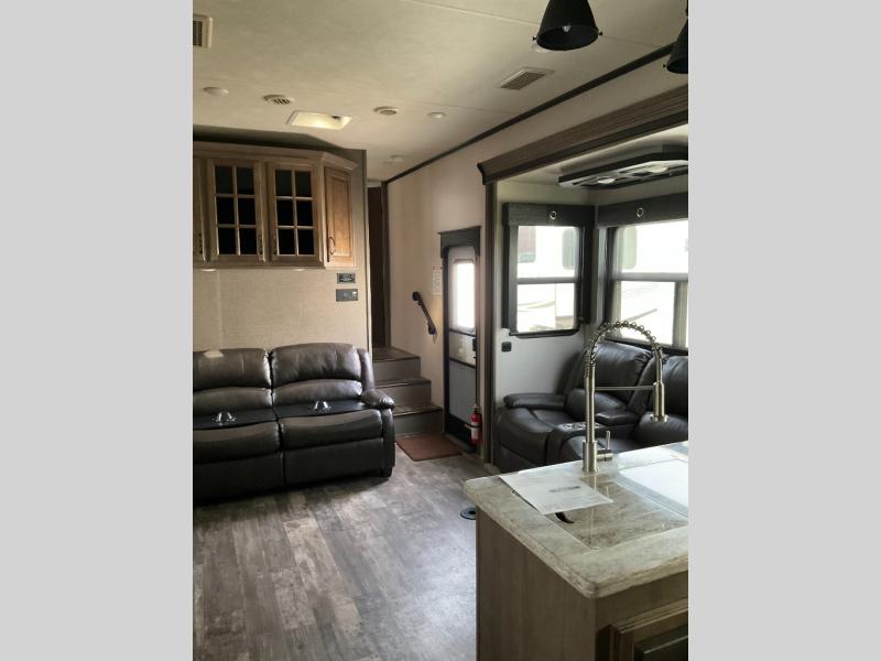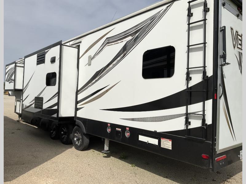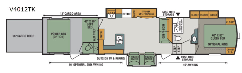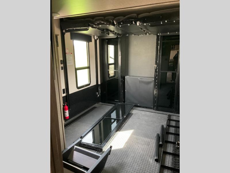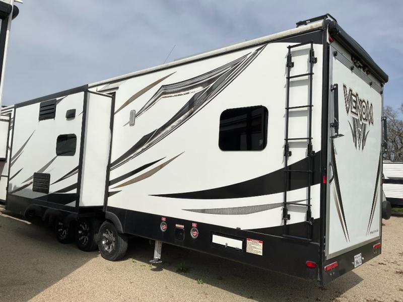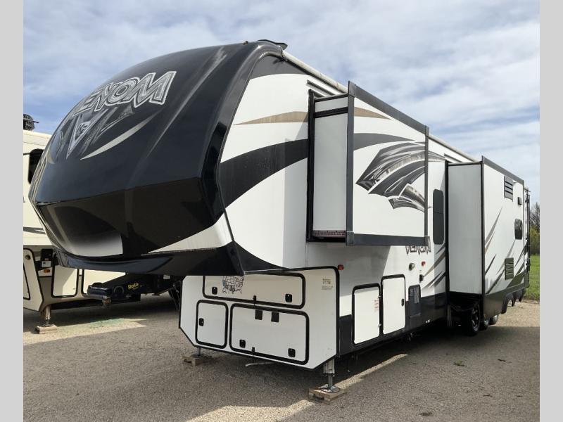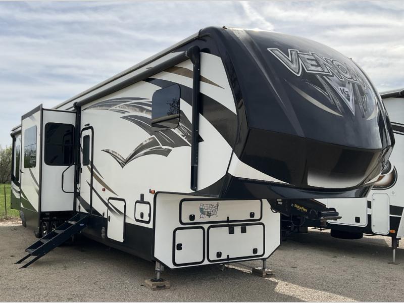 Come see just how fun and easy camping can be when you have this Venom V4012TK toy hauler fifth wheel. In the 12' separate cargo area you can park and secure your dirt bikes or a four wheeler to travel to your favorite off-road park. You will have the convenience of a half bath, side man door and power bed option. You can even add a washer and dryer option if you like. Additional sleeping space for your buddy or child can be found on the 40" x 96" loftbed, or someone may fall asleep in a theater seat in the separate living and kitchen area. You will also find a hide-a-bed sofa, TV, optional fireplace, and a U-shaped kitchen countertop, plus all the amenities necessary to make meals. At night head up to the front bedroom where you will find a queen bed, a sliding door to the dual entry bathroom, plenty of storage for your clothes and linens, plus much more. It's time to enjoy the ride without sacrificing any luxuries.