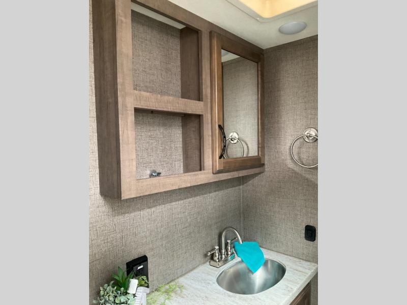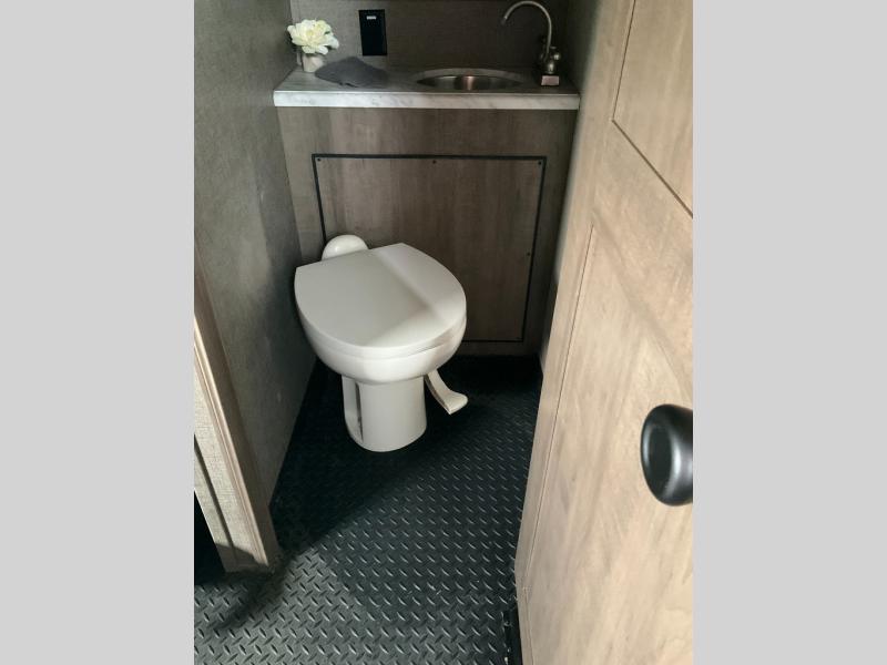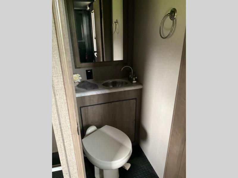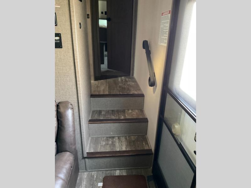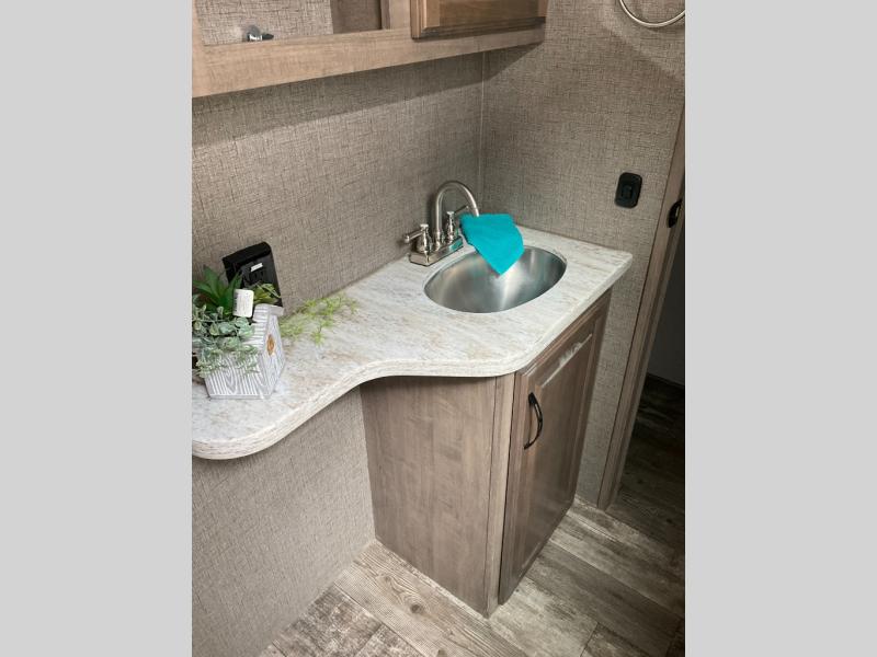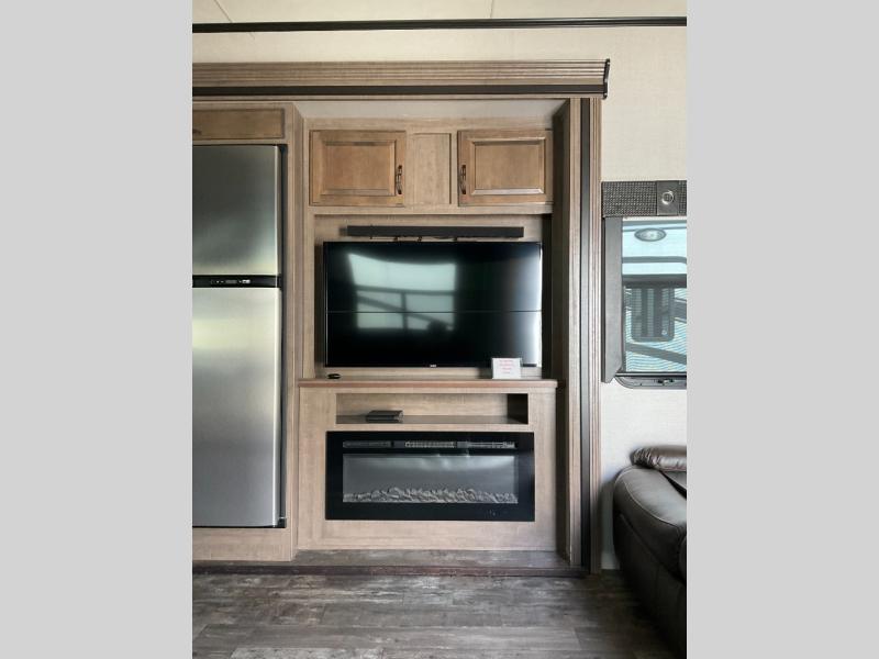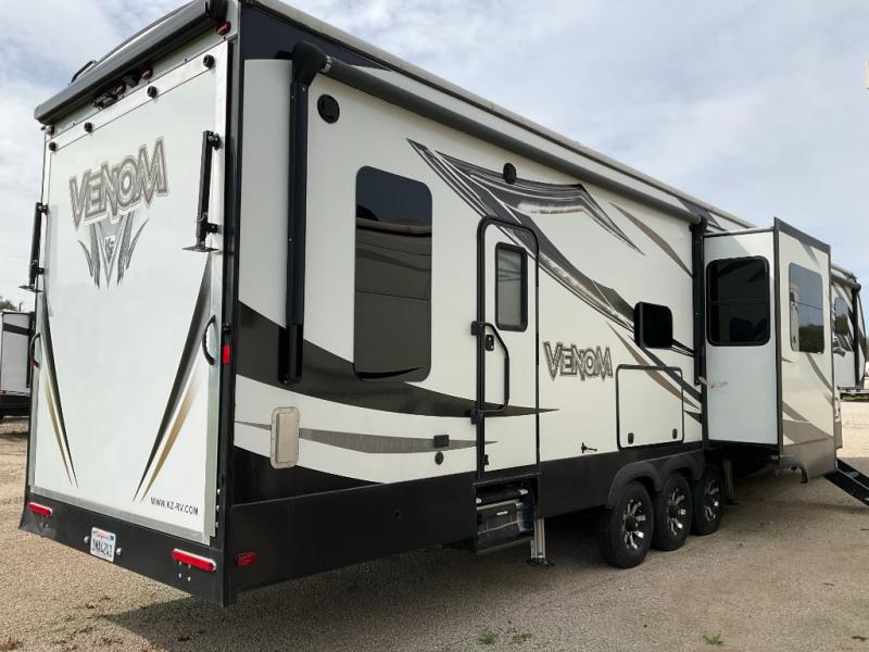 When you choose to camp with a KZ Venom toy hauler fifth wheel you are choosing quality. With exterior features such as an extra reinforced heavy-duty front fiberglass cap, Lamilux 4000 high-gloss fiberglass sidewalls, and an All Weather insulation package you can be assured that this model is built sturdy. Inside each model you will find a 7" monitor MyRV control panel which monitors tank and battery levels, controls slide rooms, leveling system, awnings, plus inside and outside lighting. There is also deluxe residential style furniture as well as a residential entertainment system with radio/Bluetooth/sound bar and Bass subwoofer. In the garage there is a roll-down screen wall, a zero gravity ramp door with easy lift assist, plus an E-Track tie-down system. Come select your Venom lightweight, high-profile, luxury toy hauler fifth wheel today!