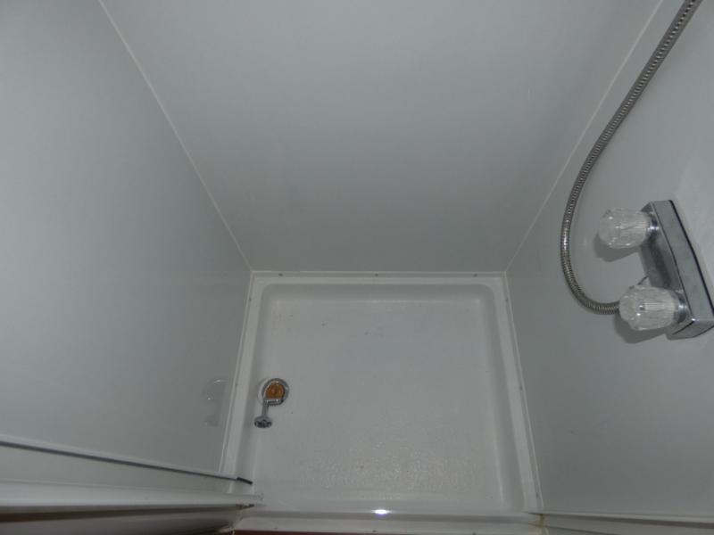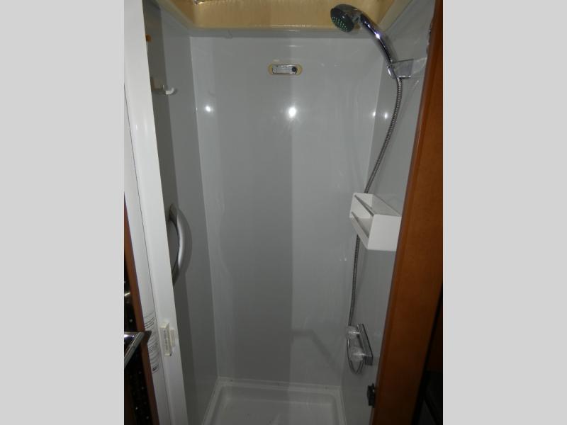 Cook up your favorite meals and snacks in the kitchen provided with a round single sink, a two burner cooktop, and overhead storage for all of your things. There is also a refrigerator to the left of the entry door opposite the sink area.