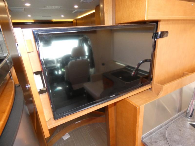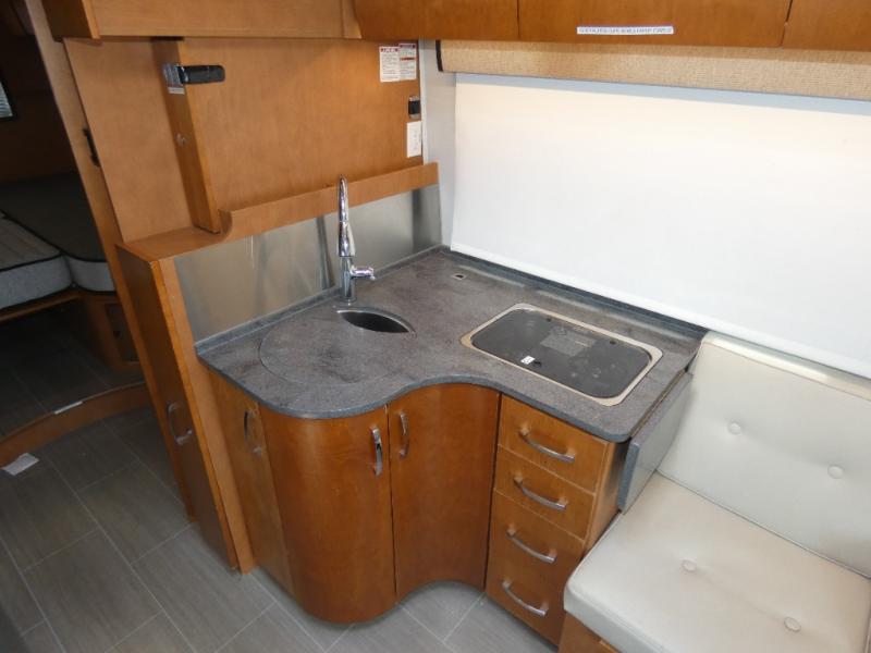 Up front the driver and passenger seats both swivel to create a comfortable place for four to enjoy a conversation with the dinette seating for two immediately behind them. The dinette table and seats can also convert to allow sleeping for one more individual if needed at night. There is also a 28" LED TV in this area for your enjoyment.