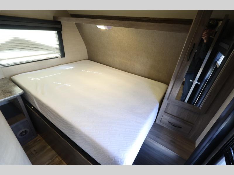 In the front of this model is a private front bedroom with an RV queen sized bed, overhead cabinets, a wardrobe at the foot of the bed, and a nightstand.