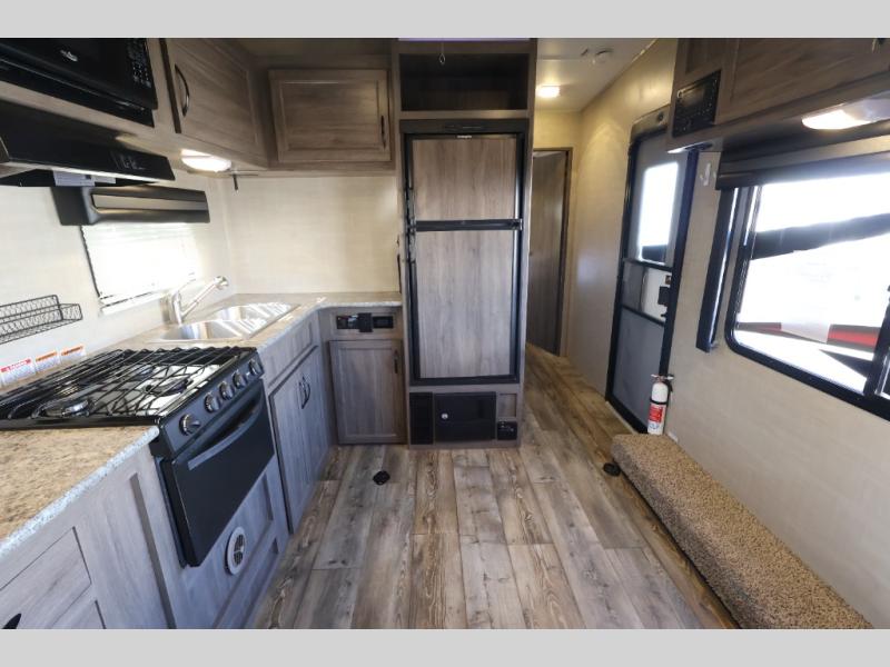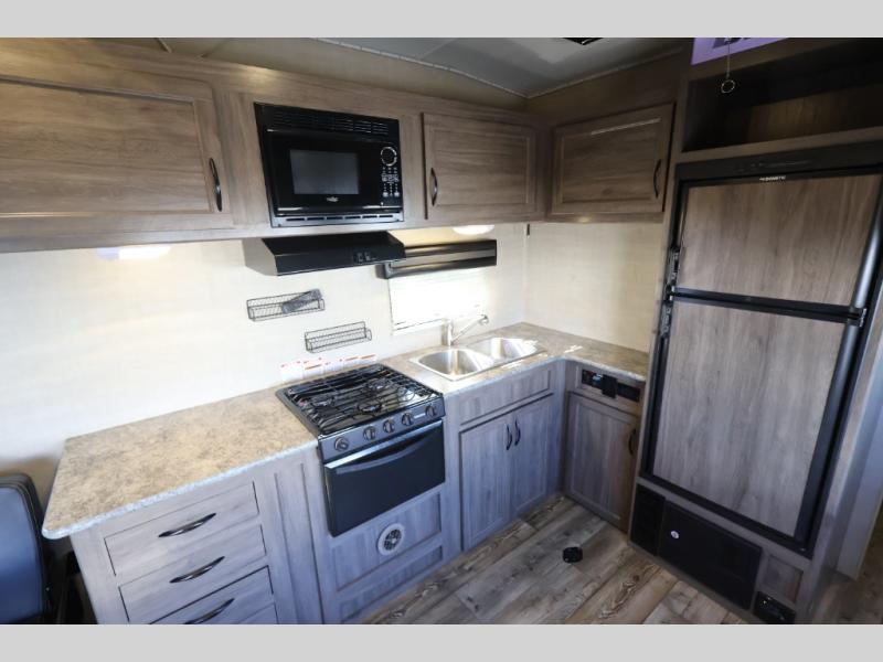 The kitchen is tucked into the front corner giving you a nice sized refrigerator to store your cold food items. There is some counter space for preparing your meals and a double sink for cleaning up those messes. You have a three burner range and an overhead microwave for cooking and some cabinets for storing dry goods and clean dishes.