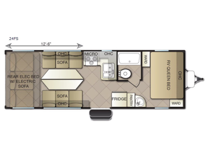 Take this Powerlite 24FS toy hauler travel trailer on your next outdoor adventure. With a rear ramp door accessing up to 12' 6" of cargo space on the roadside and 15' 9" cargo space on the opposite side, there is plenty of room for your toys. Sleep up to seven individuals comfortably, so feel free to bring along guests. Once your toys are unloaded, you can use the space for living. There are dual opposing sofas and some combo tables. There is also an electric bed and sofa in the rear that can be used as well.