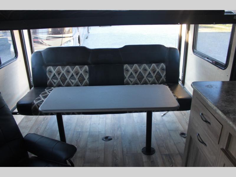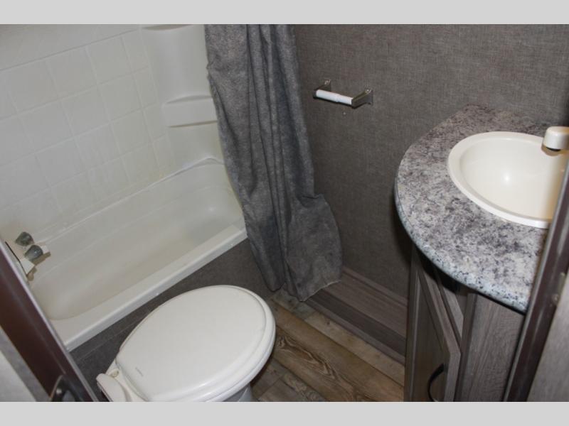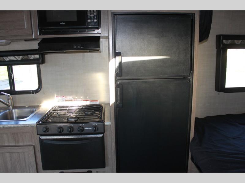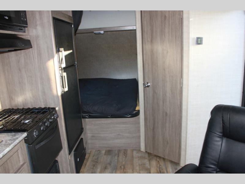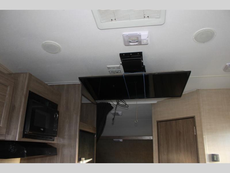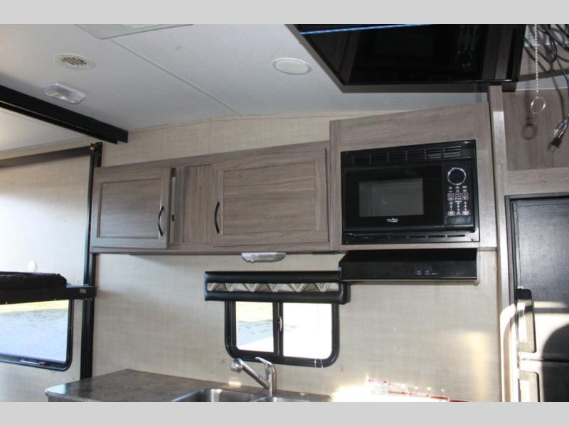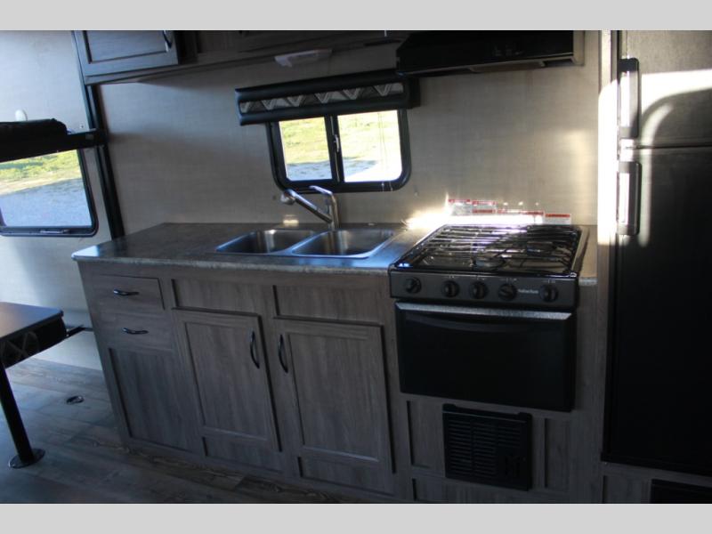 How does an RV queen bed, full bathroom, a rear sofa with table, and all the kitchen amenities to make your favorite camp meals sound in your next travel trailer toy hauler? Take a look at this Sandsport 20EX by Pacific Coachworks. As you enter, you will see there is up to 14 feet of cargo space for your off-road toys as well as overhead storage along the curbside wall. There is a double sink for easy cleanup and overhead storage for your dishes and dry goods. In the rear, you can relax or rest on the sofa, and dine at the table.