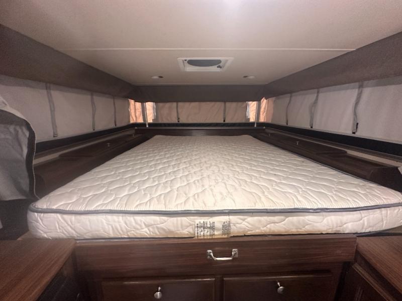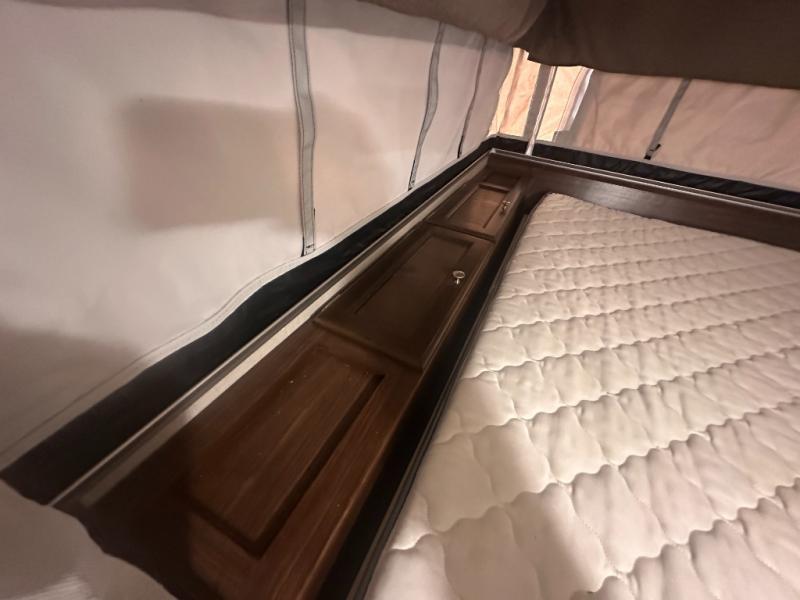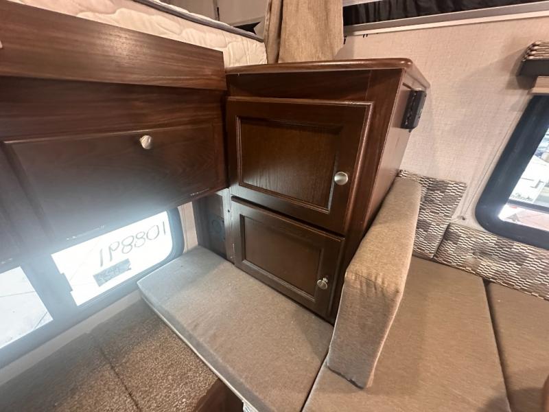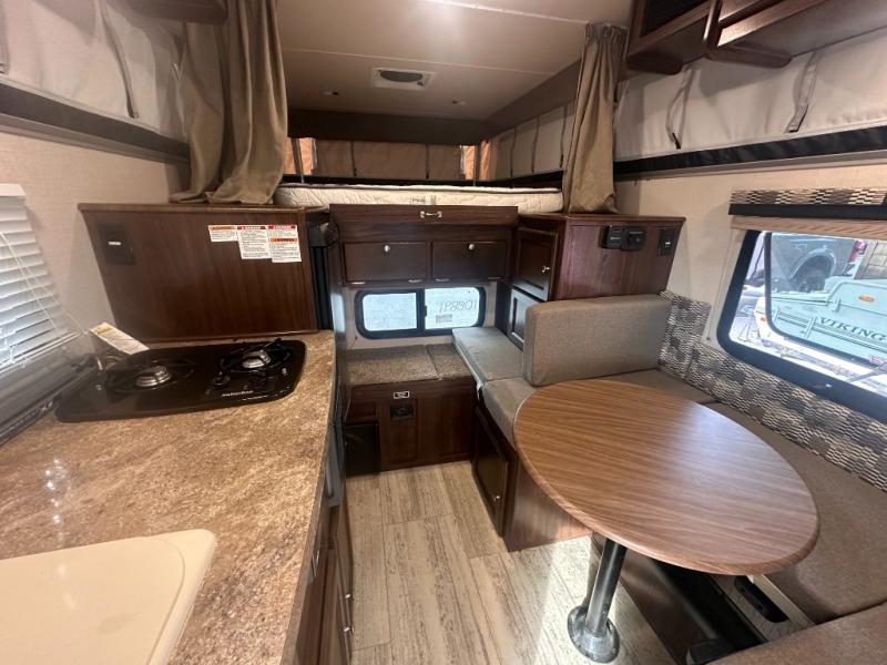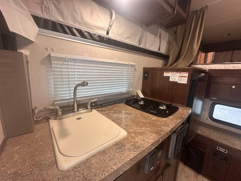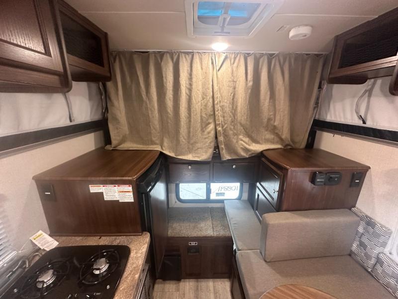 This soft side Palomino Backpack Edition truck camper can fit any 1/2 ton truck and it has everything you need and more to make all your travel adventures comfortable and convenient. You will love having the RV queen bed for a good night's rest and the u-shaped dinette with a table for relaxing, playing games, and enjoying meals with your significant other. This unit has a two burner cooktop for cooking some light meals and snacks. There is even a wardrobe with a place for a TV on top. Come take a look at this unit today!