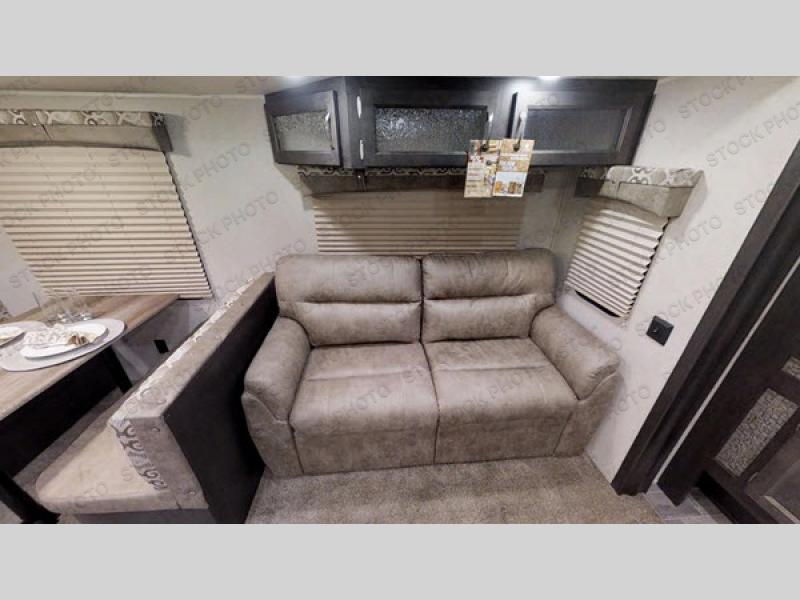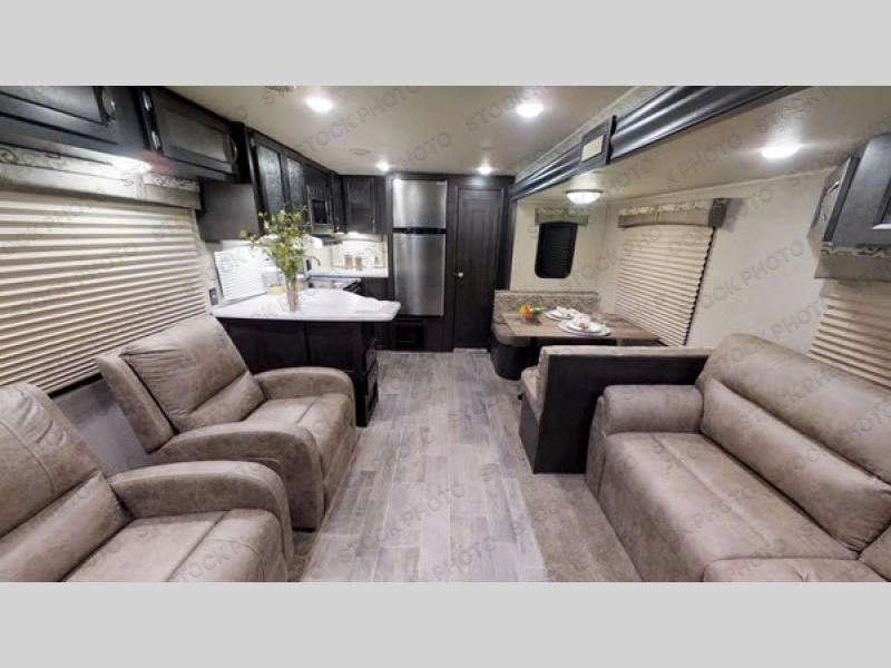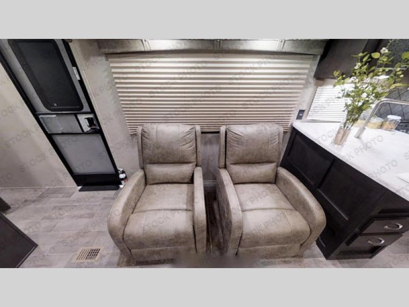 On the outside of this unit you will find ample storage in front, as well as in the rear side slide out. You can also choose to add a J-lounge in place of the two recliners inside if you like.