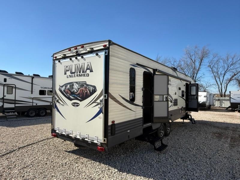 2018 PALOMINO PUMA UNLEASHED 351 THSS TOY HAULER SERIES, WITH A PARTY DECK, WITH A 12FT DEEP GARAGE. 60 GALLON FUEL STATION, Length 38FT. 2 REAR BEDS PLUS A SOFA/DINETTE SLEEPER, 2 COLD A/C, XL SLIDES, UNDERNEATH AND OVERHEAD STORAGE COMPARTMENTS. SUPER NICE KITCHEN, MULTIPLE STORAGE CABINETS. ENTERTAINMENT AREA WITH MULTIMEDIA SOUND SYSTEM, INDOOR AND OUTDOOR SPEAKERS. REMOVABLE REAR DINING TABLE. DINETTE & SOFA SLEEPERS. PRIVATE FRONT BEDROOM WITH STORAGE. OUTDOOR SHOWER. SUPER NICE UNIT. Lots Of Storage spots. Awning With LED Lighting. Sleeps 10, COLD A/C. Super Clean.. SUPER NICE TRAILER ONLY 9548 Lbs UVW. 50AMP POWER. OUR PRICE $25,995. SEVERAL SUPER NICE RVS TO CHOOSE FROM. We are located in KENNEDALE TX. We show Rv's 7 Days A WEEK BY APPOINTMENT. Call BRET 817*805*0067 or AMY 817*658*4633 FREE DELIVERY AVAILABLE TO ALL 48 STATES. WE INSPECT & GO THROUGH ALL TRAILERS TO ENSURE OUR CUSTOMERS ARE 100% SATISFIED. SE HABLA ESPANOL!