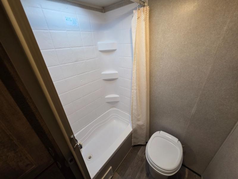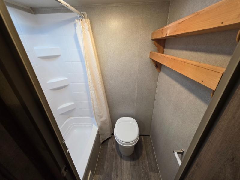 This Puma XLE Lite travel trailer is light weight and easy to tow because of its aluminum structure, but it is not light on amenities. With the exterior pass-through storage area, you will have enough space to bring along all of your camping necessities, as well as a few extras, and the kitchen pantry allows you to bring along all of the snacks you will need for game nights with the family. Because of the queen-size bed and bunk beds, this trailer can sleep five people while you travel so that no one has to miss out on the fun times ahead.
