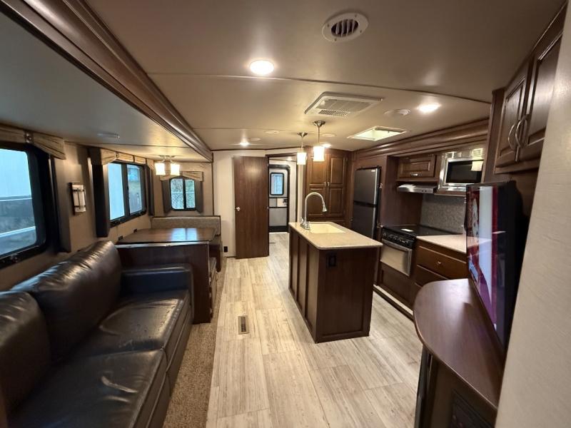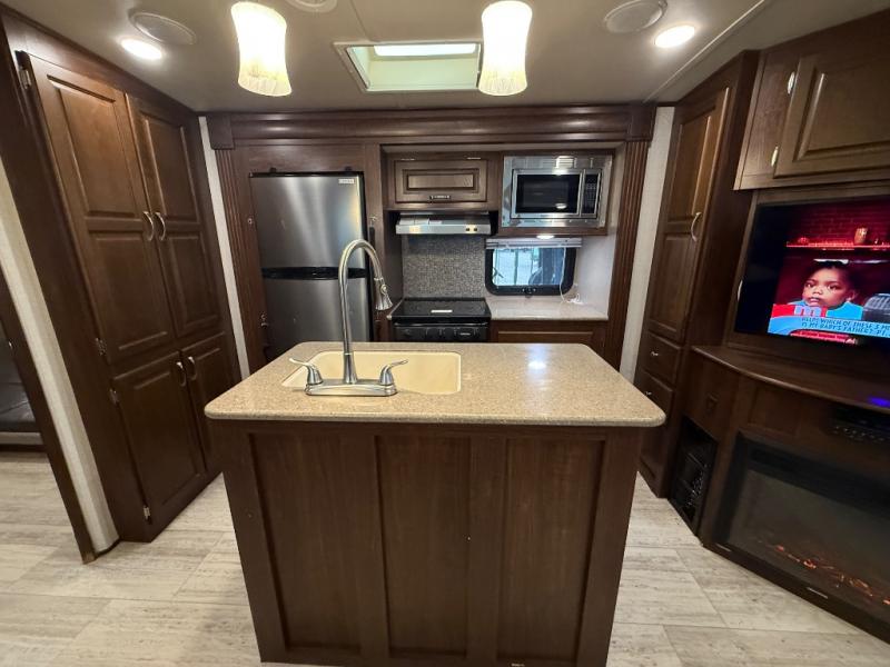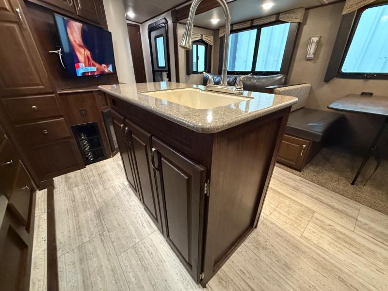 This SolAire Ultra Lite travel trailer is such a spacious and lightweight structure that provides ample room to store traveling gear, as well as plenty of sleeping space. The private bunkhouse combined with the private master suite are what give this trailer the ability to sleep nine people while on the road. Because of the addition of three slides, the kitchen island sits neatly in the center of this trailer giving you a larger area to cook up a delicious home-cooked dinner on the 3-burner range top.