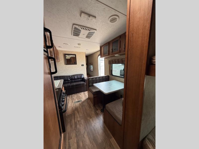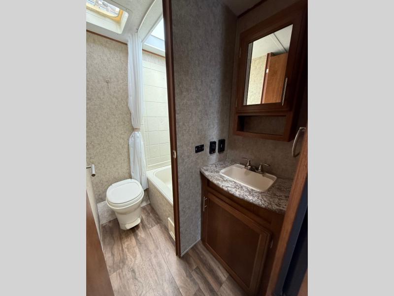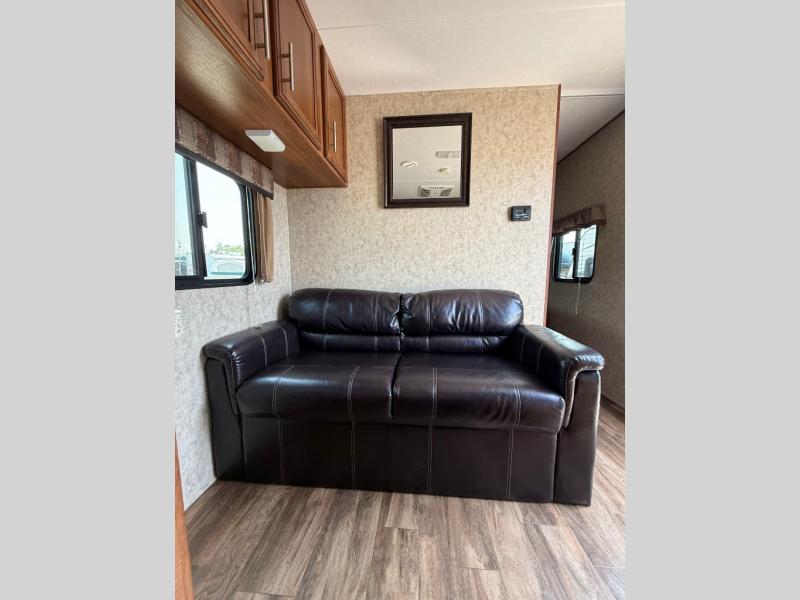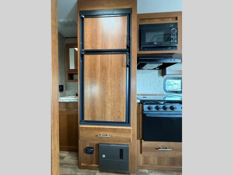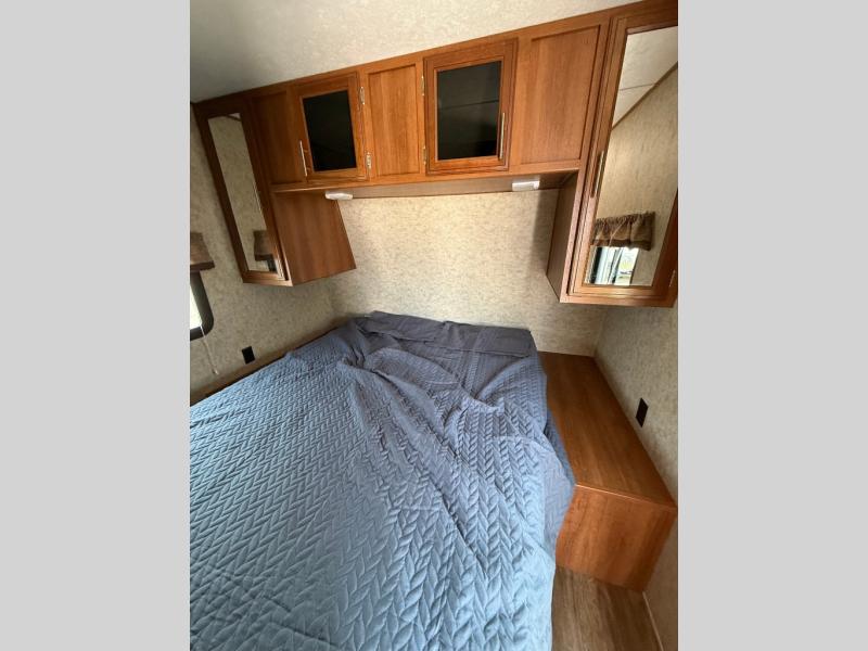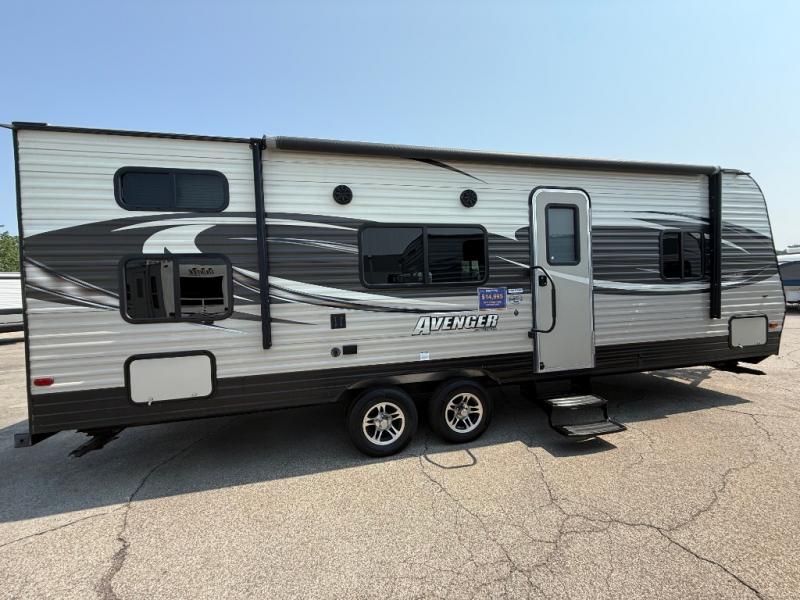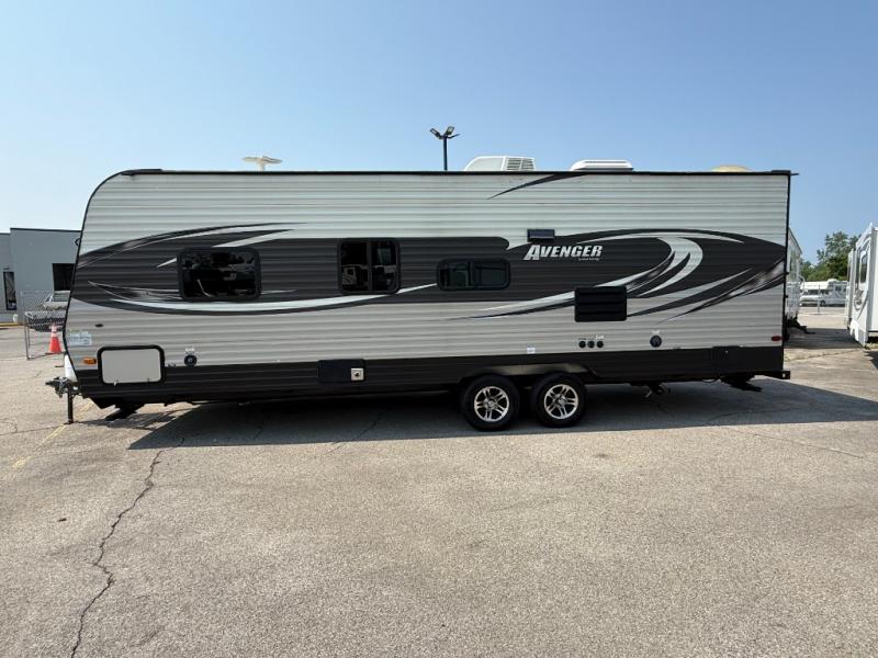 When it's time for your next get-a-away, then hook up this Avenger 26BH travel trailer and start making more memories. You are sure to enjoy the private front bedroom with a queen bed including a quilted residential bed spread for yourself while the kiddos are on the other end of the trailer on the large double size bunk beds. You will also find full kitchen amenities to prepare and serve meals to your family and friends. There is a private toilet and tub room with a sink and overhead medicine cabinet just outside the bath door. You will find sleeping space for eight when the sofa and dinette are also prepared for the night, plus more!
