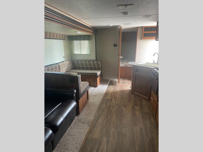 If you are a growing family that enjoys the comforts of home while away exploring at a state park, step inside this Prime Time RV Avenger ATI 27DBS travel trailer. You are sure to enjoy the entertainment center and 50" TV inside, and the exterior kitchen while cooking and visiting with other campers. From the slide out U-shaped dinette and sofa, to the queen bed in the private front bedroom, and the two double size bunk beds in the rear, you will have plenty of sleeping space for 8-10 people. You will also find full kitchen amenities inside to make snacks and meals for your whole gang on a rainy day. There is a full bath in the rear with a tub/shower including a shower curtain on a curved track for extra elbow space, and more!