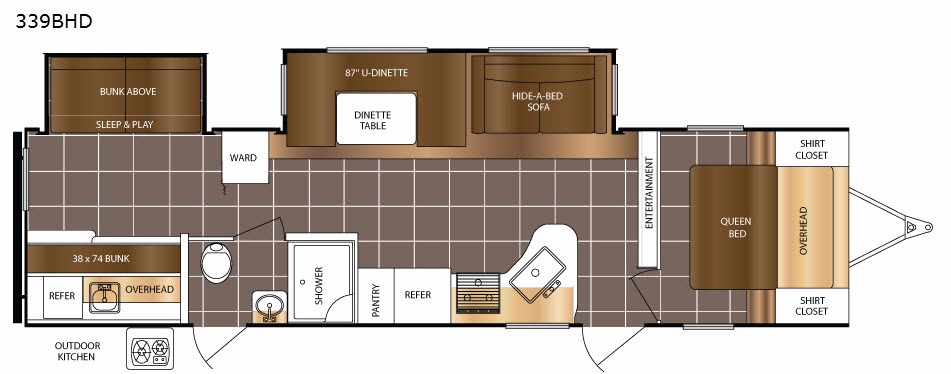 The Lacrosse 339BHD travel trailer by Prime Time Manufacturing features a rear bunkhouse, an outside kitchen, and dual entry, plus so much more!