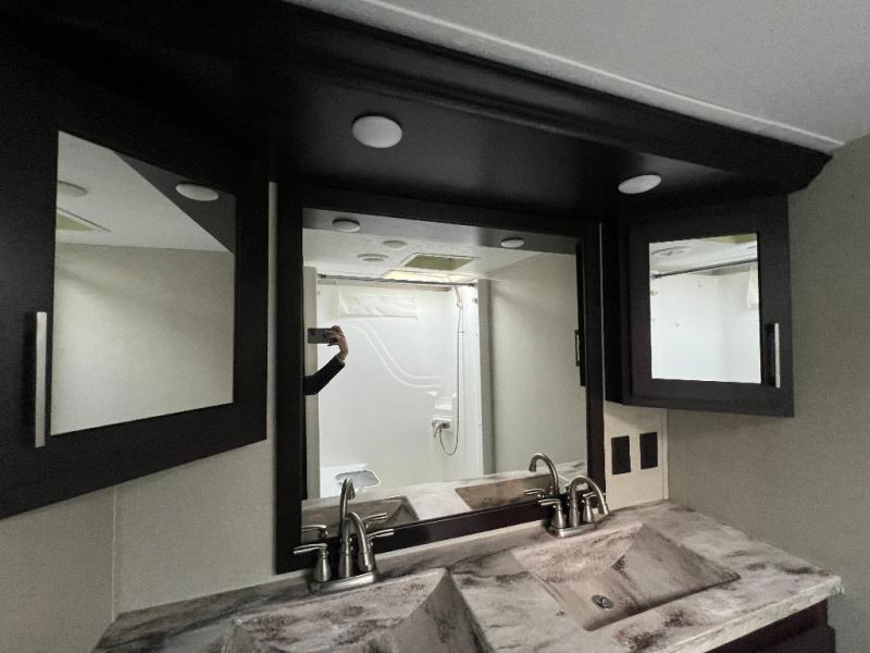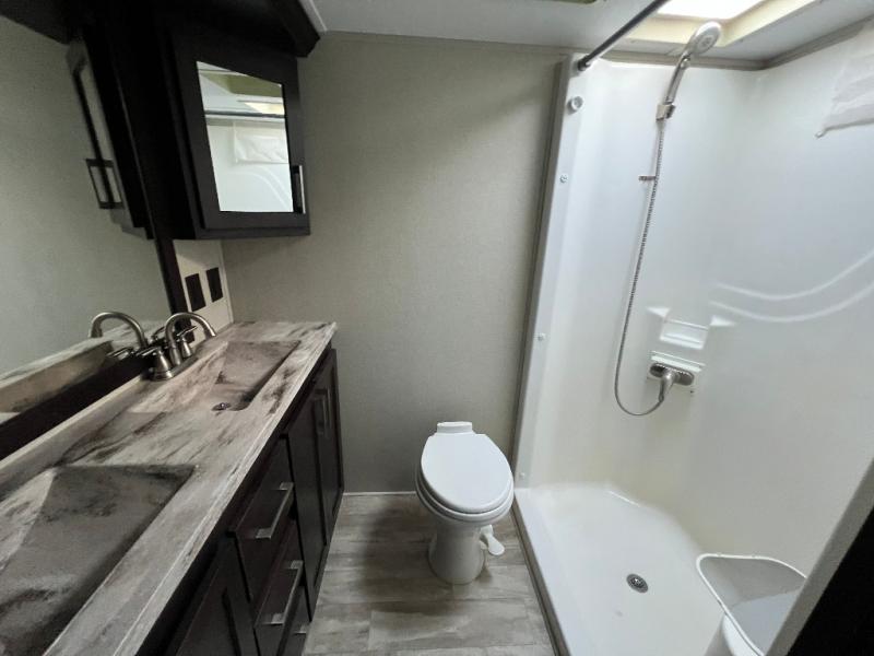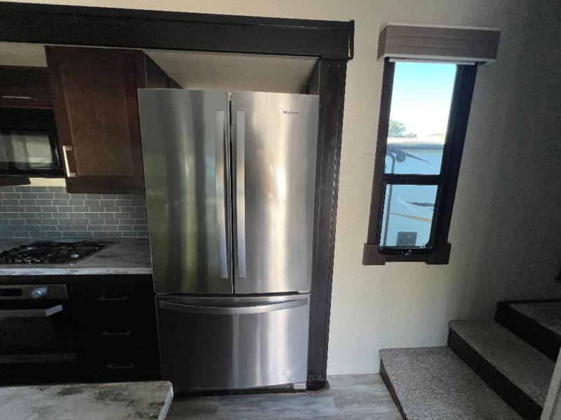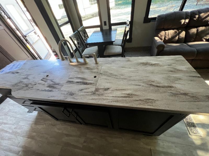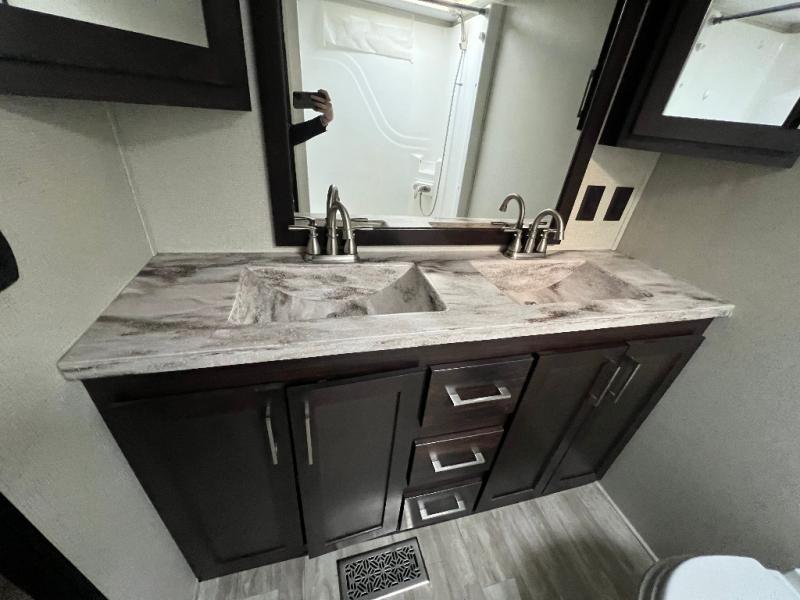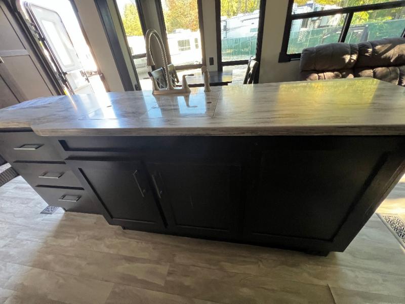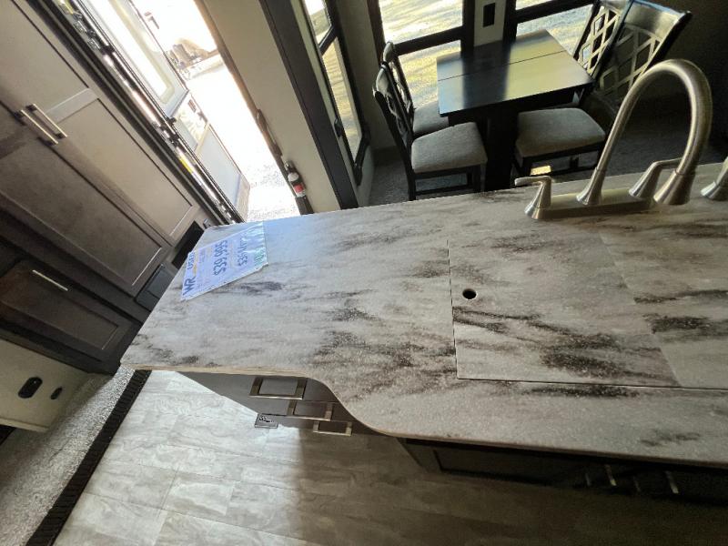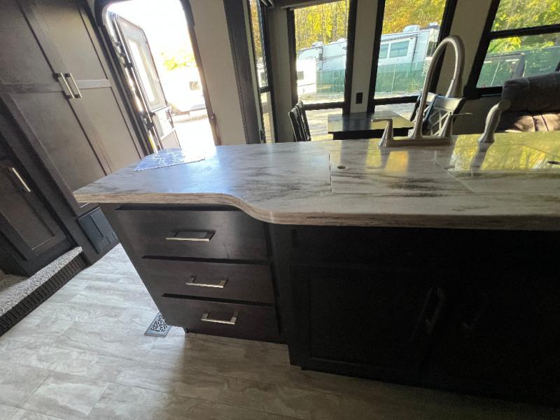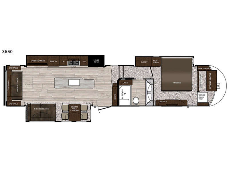 Comfort, luxury, and relaxation come to mind when entering this Sanibel fifth wheel 3650. Inside you will appreciate the dual sinks in the heated bathroom allowing more space for everyone to get ready for the day, including the 48" shower with "Stor Mor" shower caddy. When it's time to cook, the kitchen island provides plenty of counter space, a stainless steel sink with an extra deep bowl, and a 12 cu. ft. side by side refrigerator allowing you to stock up on all your favorite cold items. There is plenty of residential style seating, a king size I-Rest mattress, and a washer/dryer prepped space, plus more!